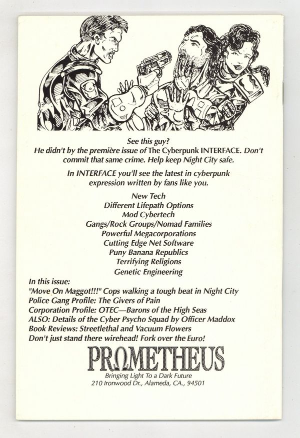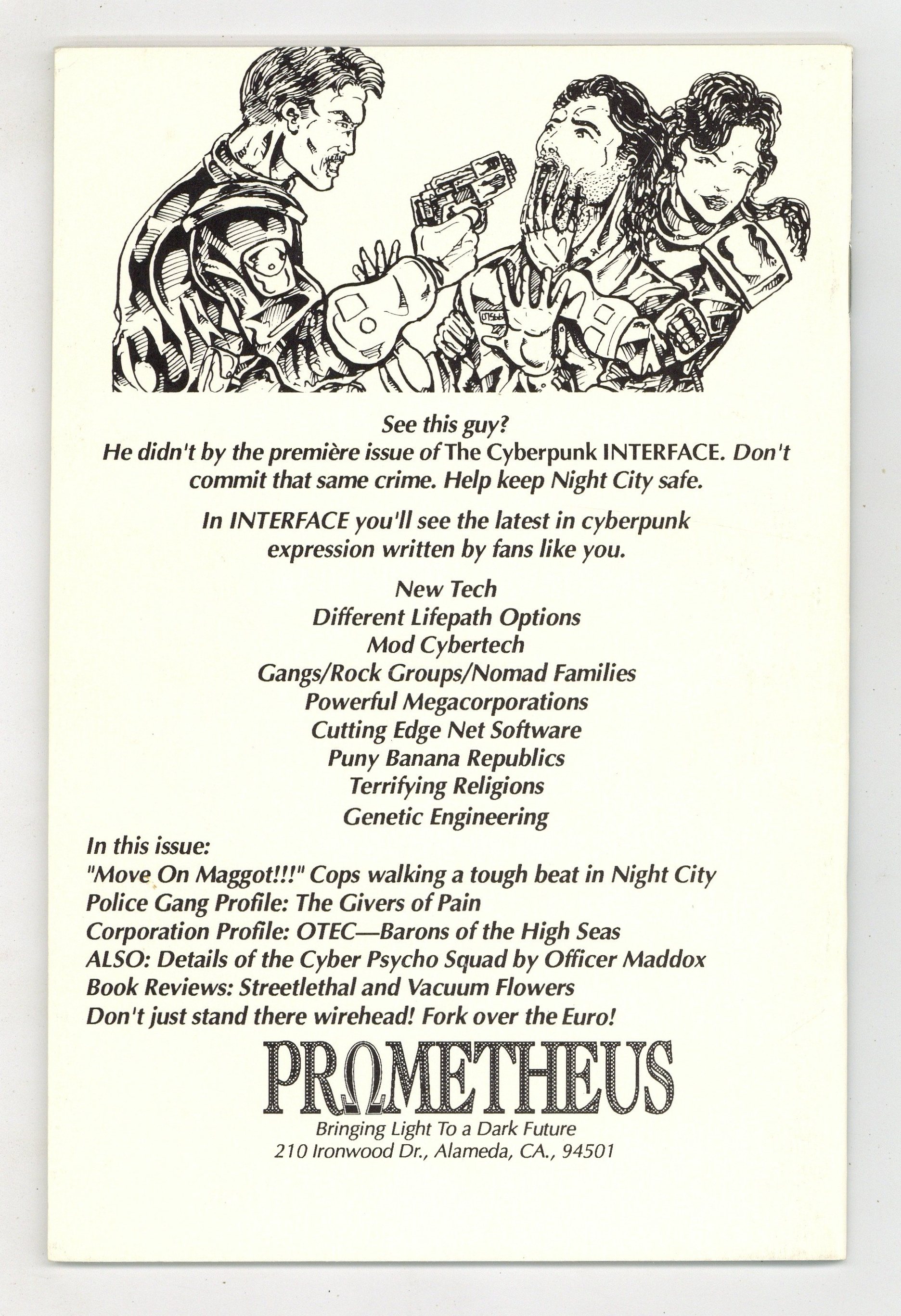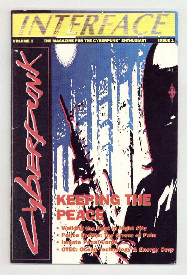 Vol. 1 No.1 - The Magazine for the Cyberpunk Enthusiast. Written by Thaddeus Howze, Chris Hockabout, and Kevin DeAntonio. Art by Kevin DeAntonio, Chris Hockabout, Dale McKee, and Justin Chin. Interface is a monthly publication for fans of the TTRPG Cyberpunk. Articles feature story ideas, miscellaneous equipment, and other optional supplements for game expansion. 48 pages. B&W. Mostly text. 5 1/2" X 8 3/8"