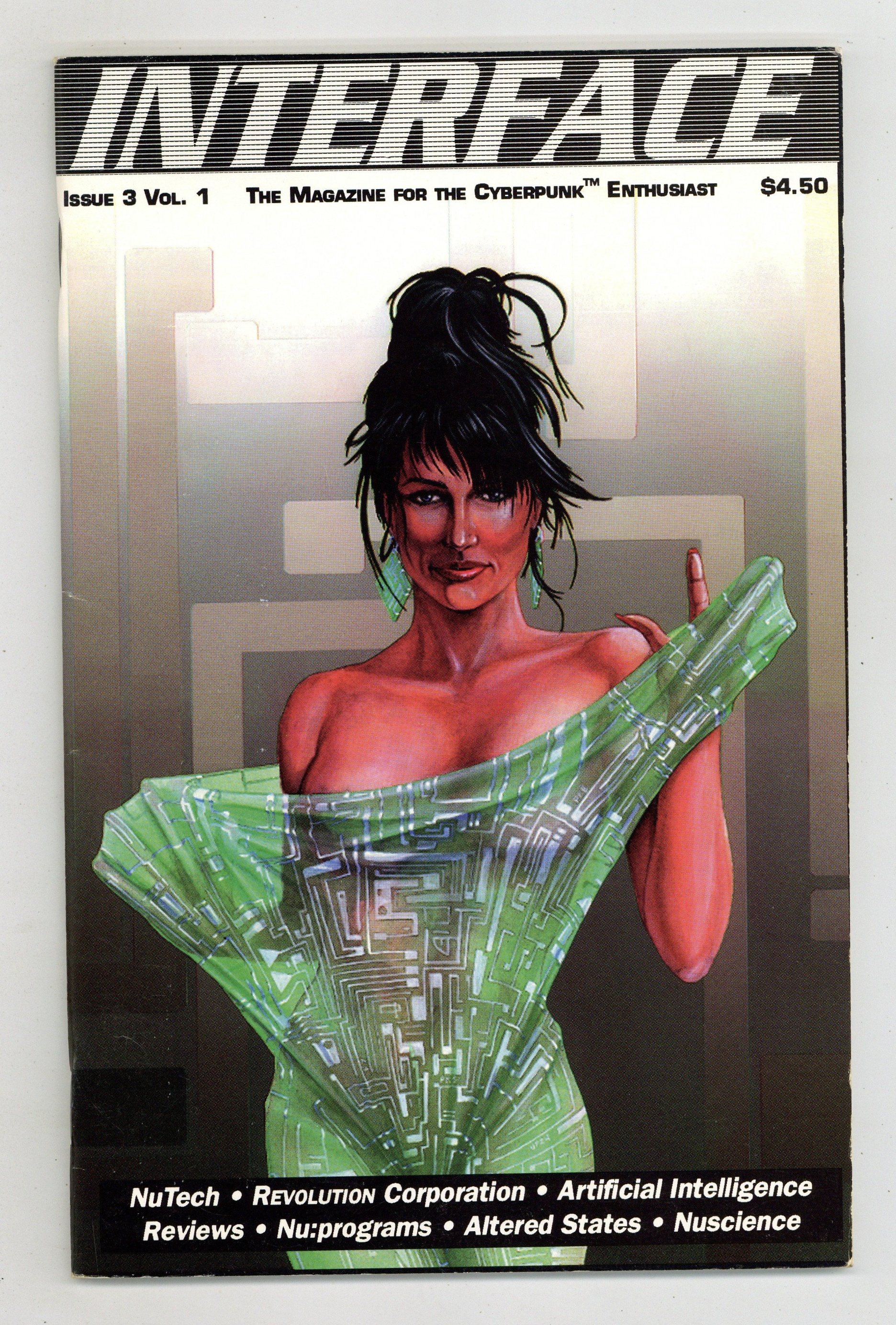 Vol. 1 No.3 - The Magazine for the Cyberpunk Enthusiast. Written by Thaddeus Howze, Peter Christian, Shadowjack, Chris Hockabout, Kevin DeAntonio, Jack of Shadows, and T.H. Stone. Art by Kevin DeAntonio and Chris Hockabout. Interface is a monthly publication for fans of the TTRPG Cyberpunk. Articles feature story ideas, miscellaneous equipment, and other optional supplements for game expansion. 60 pages. B&W. Mostly text. 5 1/2" X 8 3/8"