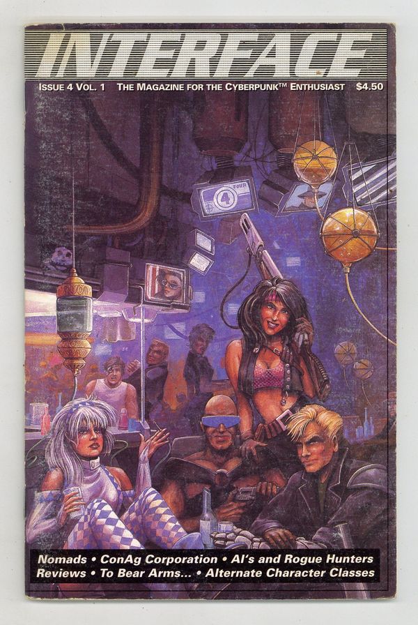 Vol. 1 No.4 - The Magazine for the Cyberpunk Enthusiast. Written by Thaddeus Howze, Barton Bolmen, Peter Christian, Shadowjack, Chris Hockabout, Kevin DeAntonio, Jack of Shadows, and T.H. Stone. Art by Chris Hockabout, Michio Okamura, and Kevin DeAntonio. Interface is a monthly publication for fans of the TTRPG Cyberpunk. Articles feature story ideas, miscellaneous equipment, and other optional supplements for game expansion. 60 pages. B&W. Mostly text. 5 1/2" X 8 3/8"