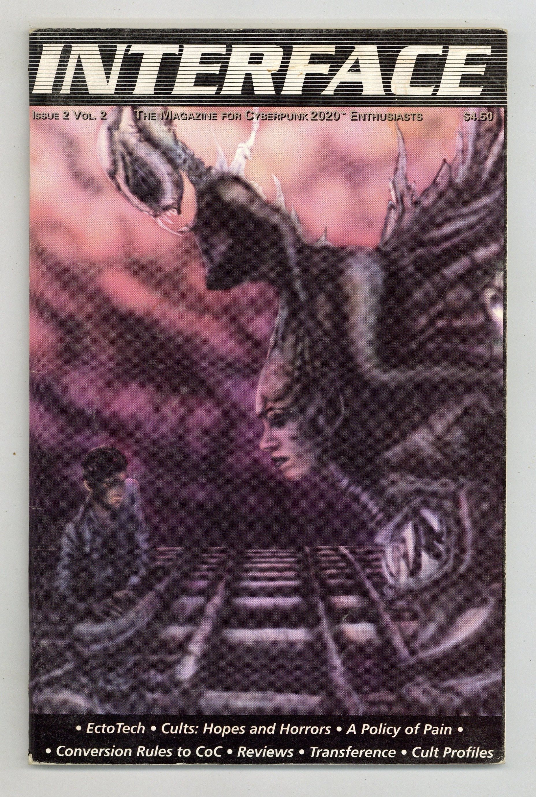 Vol. 2 No.2 - The Magazine for the Cyberpunk Enthusiast. Cover by Tom Shaw. Written by Thaddeus Howze, Barton Bolmen, Peter Christian, Chris Hockabout, Aram Gutowski, and Kevin DeAntonio. Art by Chris Hockabout, Michio Okamura, and Kevin DeAntonio. Interface is a monthly publication for fans of the TTRPG Cyberpunk. Articles feature story ideas, miscellaneous equipment, and other optional supplements for game expansion. 72 pages. B&W. Mostly text. 5 1/2" X 8 3/8"