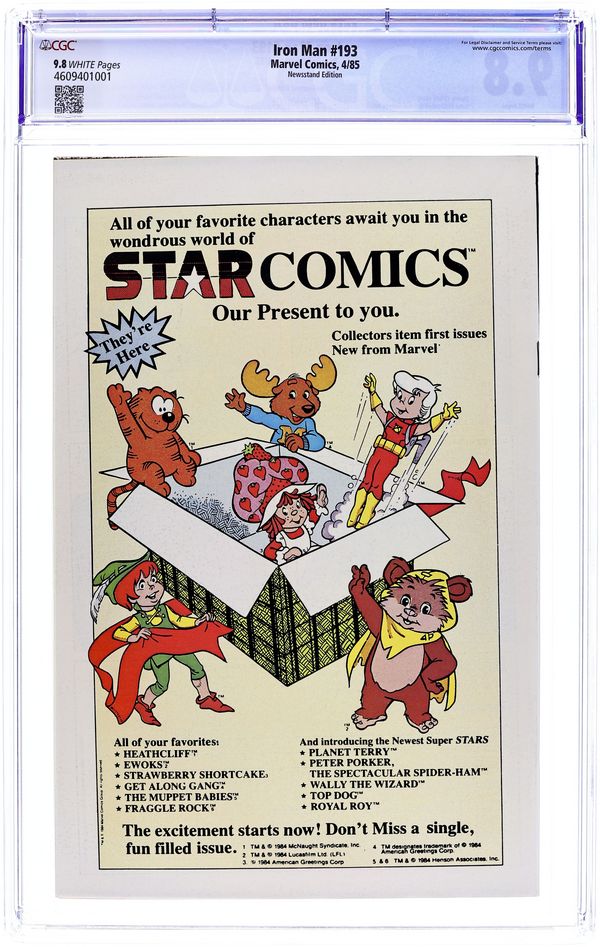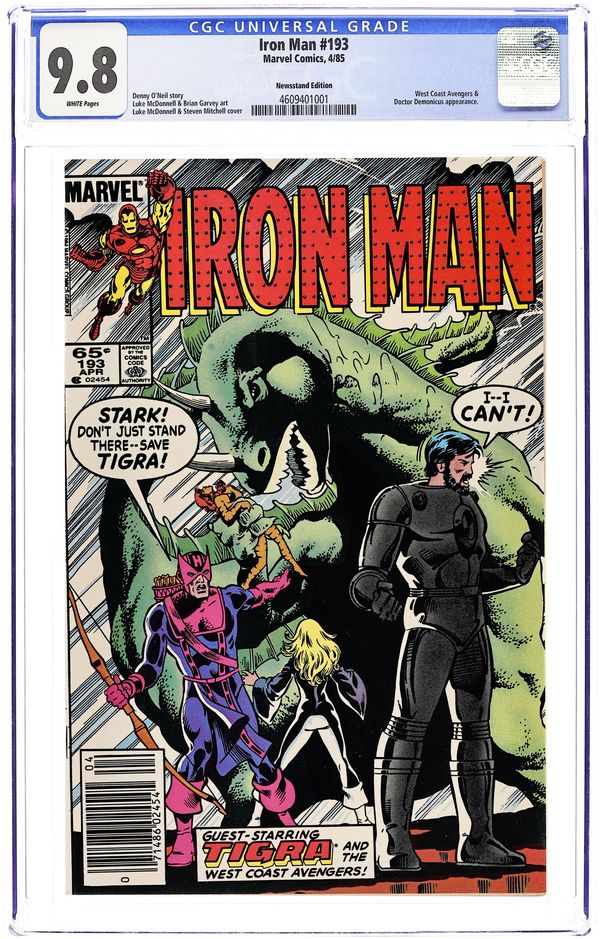 Newsstand Edition. "The Choice and the Challenge!" Guest-starring Hawkeye, Mockingbird, and Tigra. Script by Denny O'Neil. Pencils by Luke McDonnell. Inks by Ian Akin and Brian Garvey. Cover by Luke McDonnell, Ian Akin, and Brian Garvey. Tony Stark stops by the Avengers' compound to tell Hawkeye that Iron Man(aka Jim Rhodes) is taking a leave of absence from the team! However while Tony is there, a distress call comes in from Tigra! Apparently she's trapped in a quinjet on a small Pacific Island with a large green dinosaur closing fast! Whoa, is that Godzilla? Maybe so! Hawkeye and Mockingbird scramble another quinjet and invite the original Iron Man to come along! But Tony's not so sure about going! Could the West Coast Avengers defeat Dr. Demonicus and Godzilla without the former golden avenger? The odds would be stacked against them! Cameo appearances by Jim Rhodes and Bethany Cabe. Flashback cameos by Captain America and Obadiah Stane. First 65¢ issue. (Notes: Dr. Demonicus previously appeared in Shogun Warriors (1979) #14. This story was reprinted in 2010 in the hardcover: Iron Man Iron Monger. The hardcover collects Iron Man issues 193 thru 200.) 32 pages. Cover price $0.65.