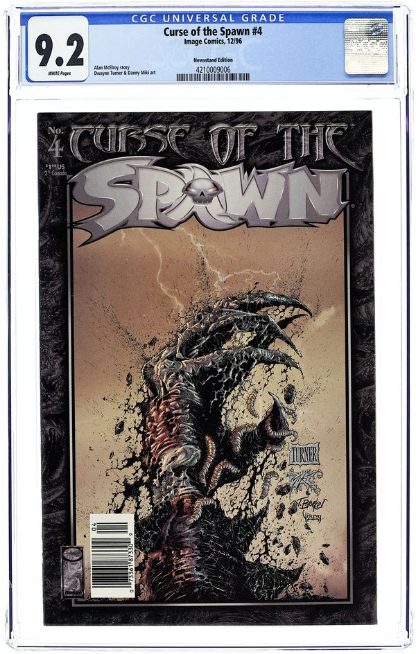 Newsstand Edition. Cover pencils by Dwayne Turner, inks by Danny Miki. Damnation War, script by Alan McElroy, pencils by Dwayne Turner, inks by Danny Miki; Spawn saves his son Matthew from Abaddon the Destroyer. 36 pgs. $1.95. Cover price $1.95.
