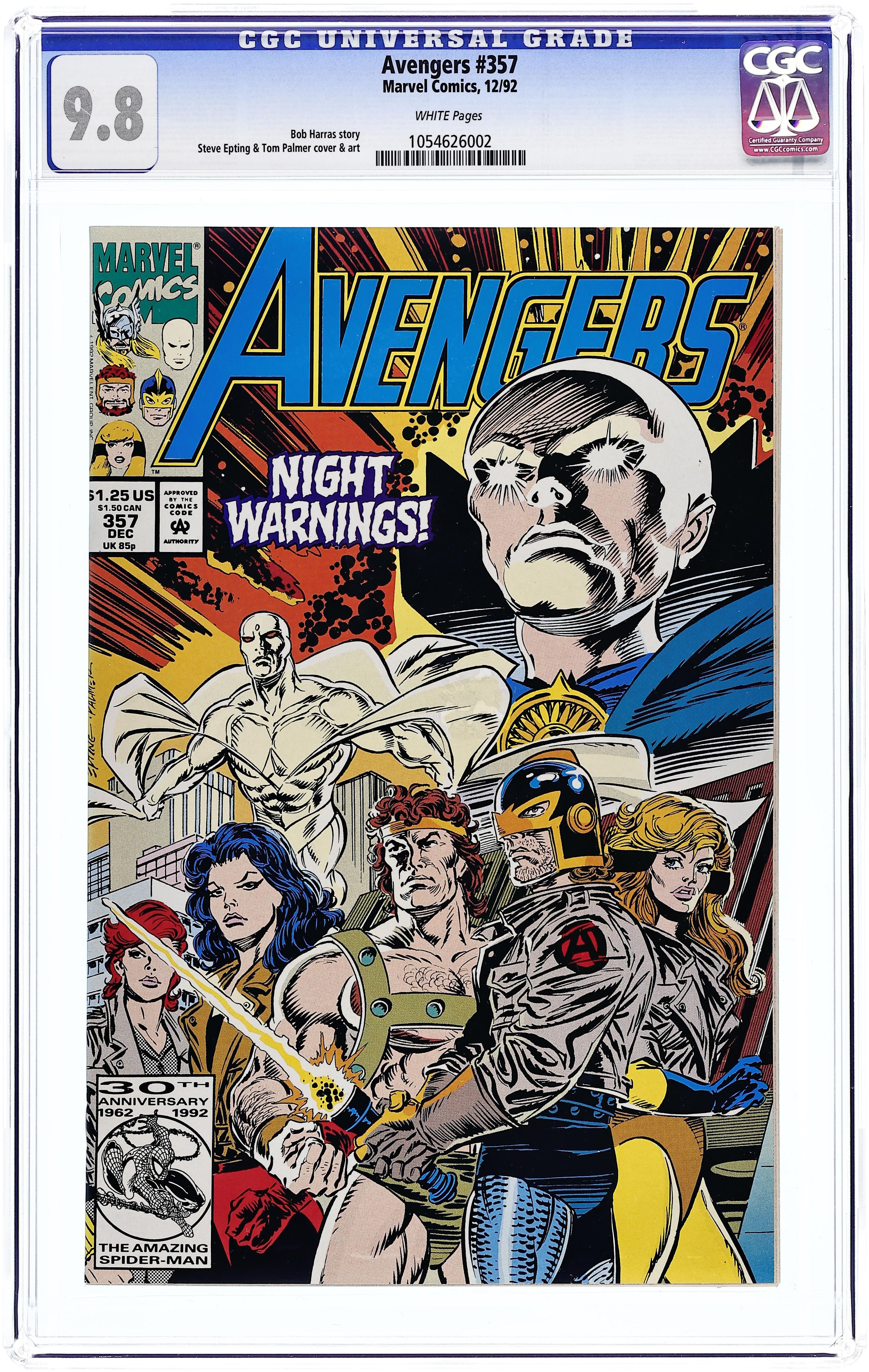 The Gatherers Saga: Part 7 of 18 - "The Night Visitors" Script by Bob Harras. Pencils by Steve Epting. Inks by Tom Palmer. Cover by Steve Epting and Tom Palmer. Earth's Mightiest Heroes take a break from their ongoing struggle with the Gatherers and host a formal dinner party to celebrate their coming together as a team. As a guest of Hercules, Taylor Madison attends the formal dinner at the mansion too. However the festive evening comes to an abrupt halt when a most unexpected guest drops in! The Watcher! Oh my, what is the cryptic meaning of the omnipotent one's visit? The Avengers know it can't be good! But only time will tell. In the meantime several avengers express their concern about Sersi's recent behavior…and the growing romantic triangle among Crystal, Dane Whitman, and the enchanting Eternal. First appearance of Scanner (aka Screener). Cameo appearances by the Swordsman, Lockjaw, Hera, Zeus, Scanner, Luna, and the Watcher. (Note: This issue includes a full-page pin-up (by Steve Epting and Tom Palmer) of the alternate cover to Avengers 357.) 36 pages Cover price $1.25.