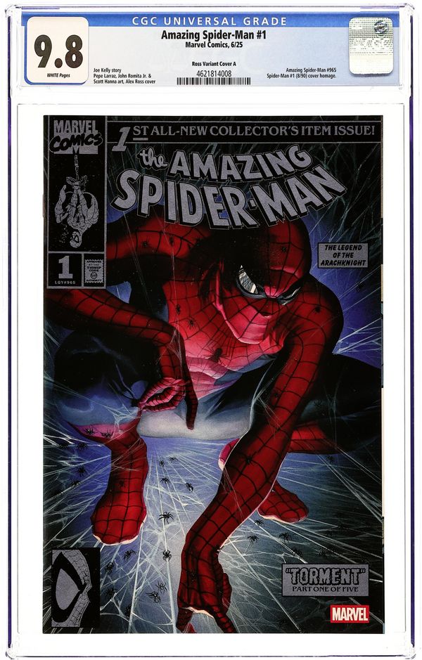 AlexRossArt.com Exclusive Variant Cover by Alex Ross. Written by Joe Kelly. Art by Pepe Larraz; John Romita Jr. ALIVE & THWIPPING! The next era of AMAZING SPIDER-MAN has arrived! Peter is, shockingly, without a job and looking for gainful employment, but his job search is interrupted by a RAMPAGING RHINO who is but the tip of a sinister iceberg. What major Spider-Villain is working behind the scenes weaponizing other Spider-Villains including one we havent seen in OVER SEVEN YEARS?! Also, what is that Goblin-free Norman Osborn up to anyway? 40 pages, full color. Rated T