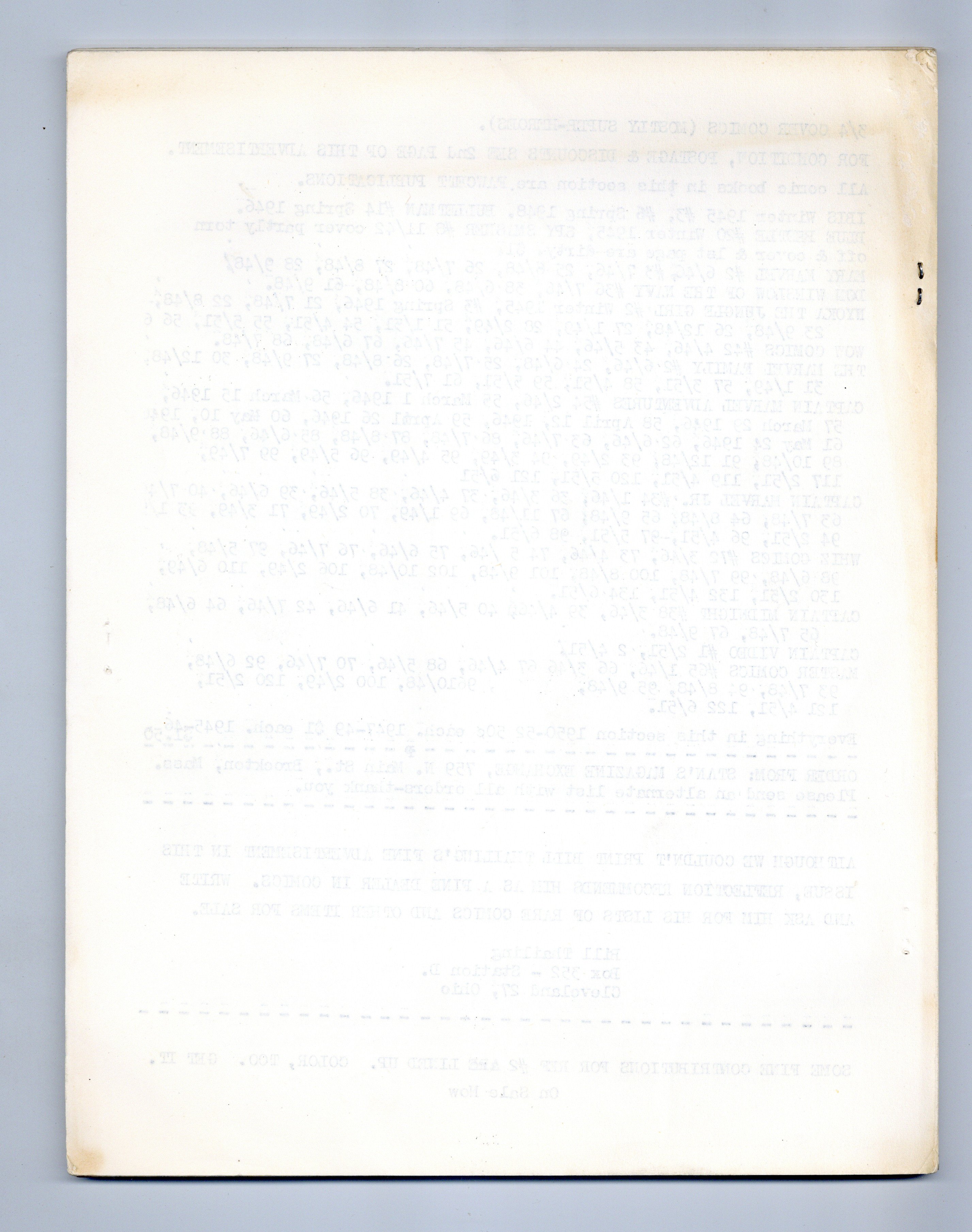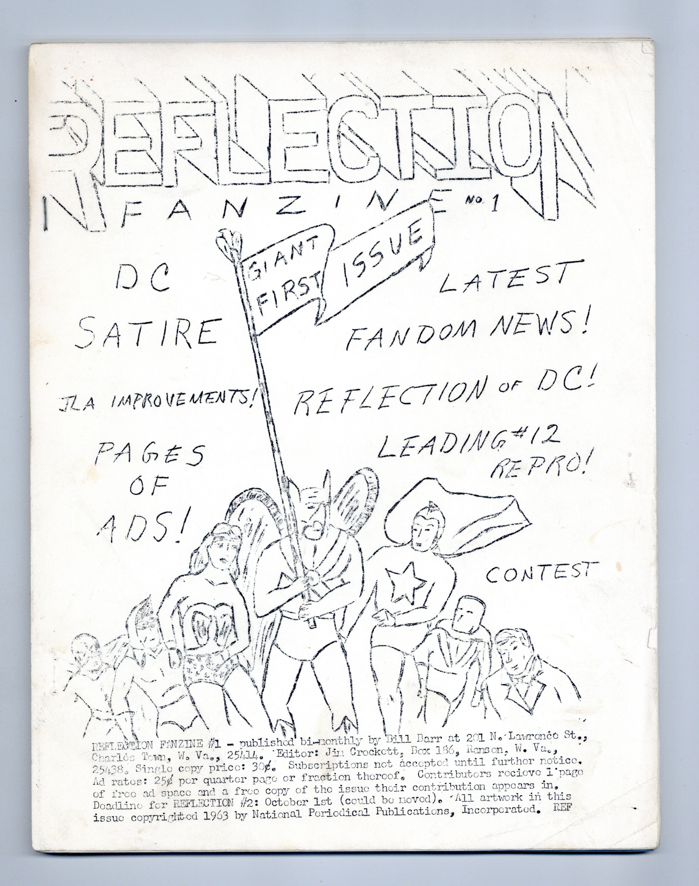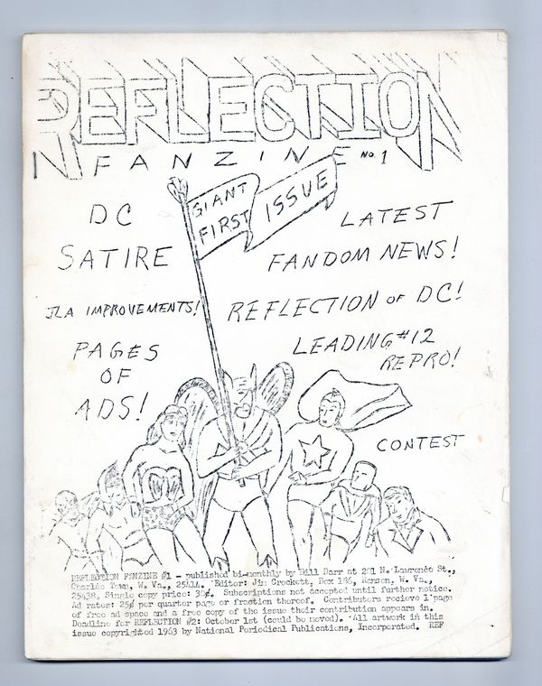 Early comic fanzine out of West Virginia, published by Bill Barr and edited by Jim Crockett. This issue includes a listing of all DC titles published up that point - with reading recommendations, comic news, contributor art, and dealer ads for comics including a two-page ad from Roy Thomas. 8.5" x 11", 32 single-sided pages, B&W. Cover price $0.30.