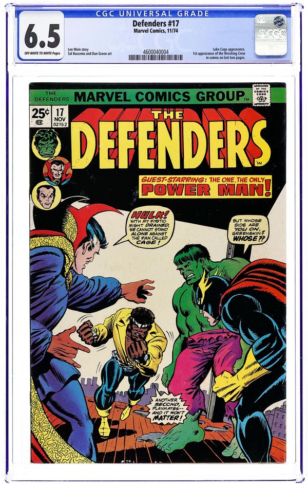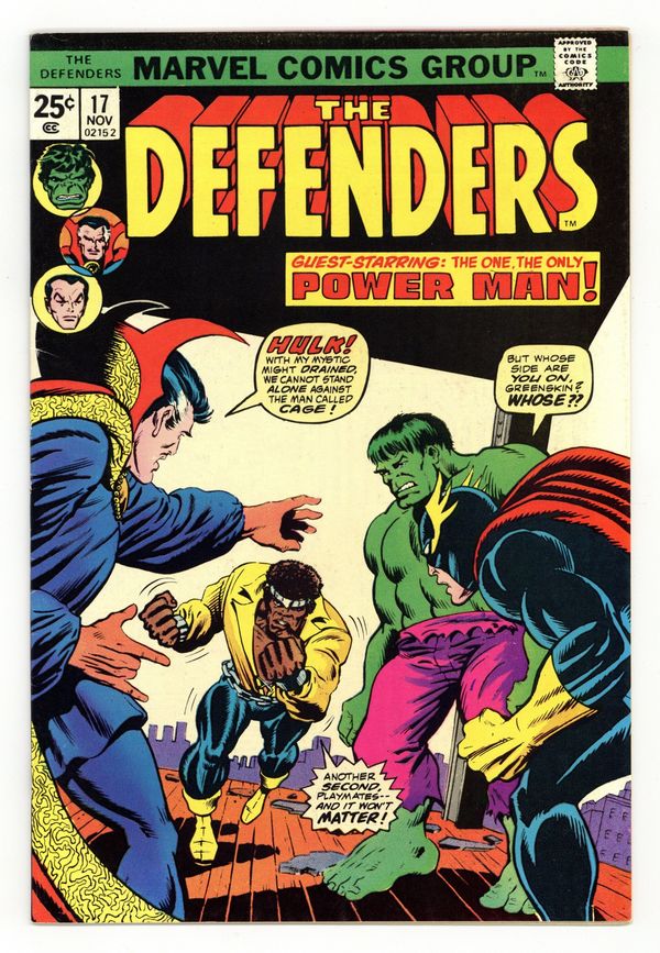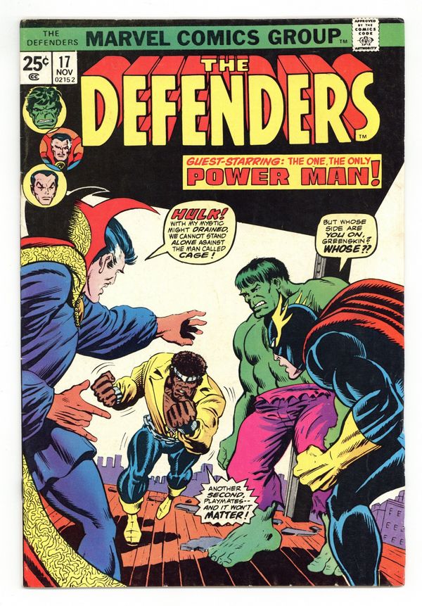 Starts Dec 15 "Power Play!" Part 1 of 3. Guest-starring Power Man. Script by Len Wein. Pencils by Sal Buscema. Inks by Dan Green. The Wrecking Crew has destroyed two of Kyle Richmond's skyscrapers in New York City! And are now threatening to demolish an unfinished third one! However, Doctor Strange and Nighthawk converge on the construction site to protect it! But unknown to the two defenders, someone else has already been hired to guard the skyscraper...Luke Cage! A genuine misunderstanding leads to a fierce struggle between Power Man and the Defenders! And that's just fine for the four super-villains lurking in the background! Cameo appearances by Walter Cronkite, Valkyrie, the Hulk, Wrecker, Thunderball, Bulldozer, and Piledriver. (Notes: The Wrecker previously appeared in Thor 171. The letters page contains Marvel Value Stamp Series A #20 Brother Voodoo.) 36 pages Cover price $0.25.