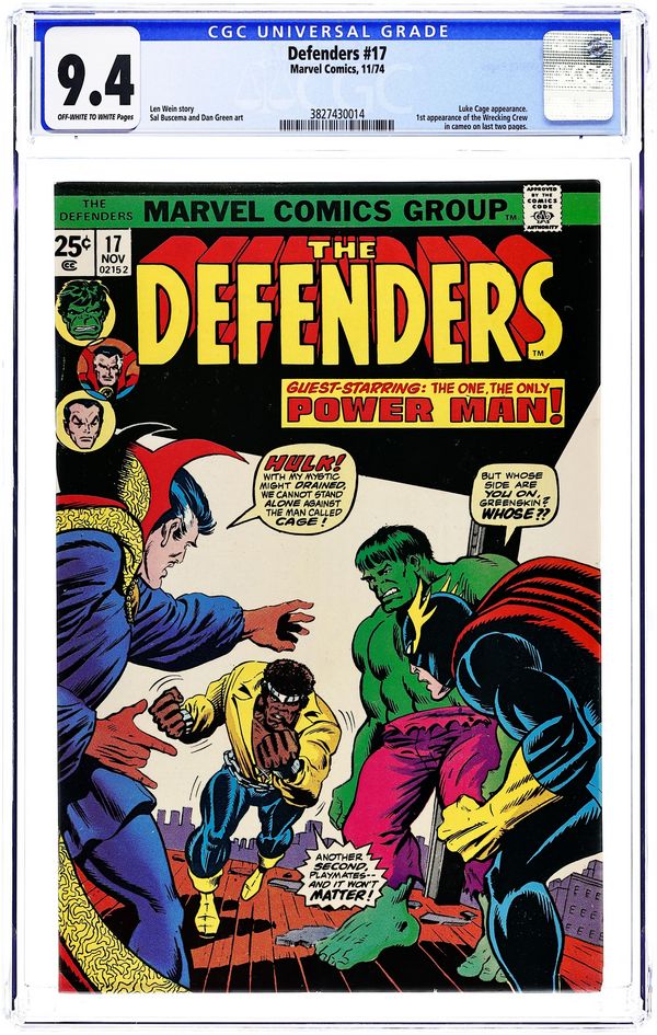 Starts Dec 8 "Power Play!" Part 1 of 3. Guest-starring Power Man. Script by Len Wein. Pencils by Sal Buscema. Inks by Dan Green. The Wrecking Crew has destroyed two of Kyle Richmond's skyscrapers in New York City! And are now threatening to demolish an unfinished third one! However, Doctor Strange and Nighthawk converge on the construction site to protect it! But unknown to the two defenders, someone else has already been hired to guard the skyscraper...Luke Cage! A genuine misunderstanding leads to a fierce struggle between Power Man and the Defenders! And that's just fine for the four super-villains lurking in the background! Cameo appearances by Walter Cronkite, Valkyrie, the Hulk, Wrecker, Thunderball, Bulldozer, and Piledriver. (Notes: The Wrecker previously appeared in Thor 171. The letters page contains Marvel Value Stamp Series A #20 Brother Voodoo.) 36 pages Cover price $0.25.