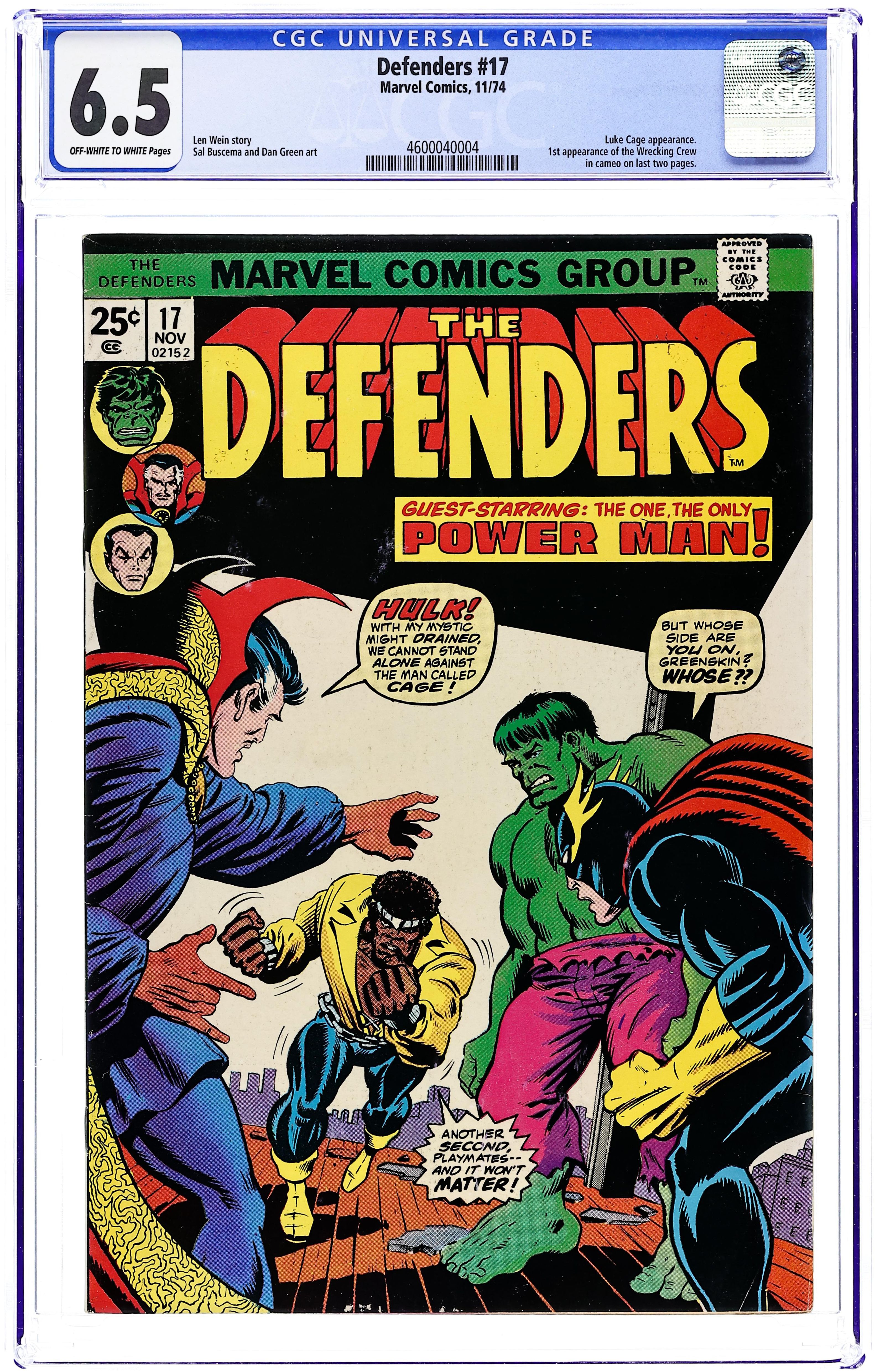 "Power Play!" Part 1 of 3. Guest-starring Power Man. Script by Len Wein. Pencils by Sal Buscema. Inks by Dan Green. The Wrecking Crew has destroyed two of Kyle Richmond's skyscrapers in New York City! And are now threatening to demolish an unfinished third one! However, Doctor Strange and Nighthawk converge on the construction site to protect it! But unknown to the two defenders, someone else has already been hired to guard the skyscraper...Luke Cage! A genuine misunderstanding leads to a fierce struggle between Power Man and the Defenders! And that's just fine for the four super-villains lurking in the background! Cameo appearances by Walter Cronkite, Valkyrie, the Hulk, Wrecker, Thunderball, Bulldozer, and Piledriver. (Notes: The Wrecker previously appeared in Thor 171. The letters page contains Marvel Value Stamp Series A #20 Brother Voodoo.) 36 pages Cover price $0.25.