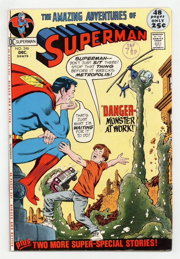 Tags: Giant-Sized Issue, Superman$16.00Cover pencils by Curt Swan, inks by Murphy Anderson. Danger--Monster At Work! starring Superman, script by Len Wein, pencils by Curt Swan, inks by Murphy Anderson; intro of S.T.A.R. Labs. Marriage, Kryptonian Style!--Fabulous World of Krypton starring Superman, Jor-El, and Lara, script by Cary Bates, pencils by Rich Buckler, inks by Murphy Anderson. There Is No Superman!, script by Jerry Siegel, art by Ira Yarbrough. 52 Pages, Full Color. Cover price $0.25.