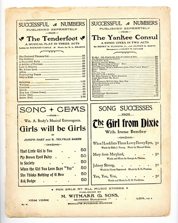 Published 1904 by M. Witmark & Sons.$36.00- Water damage: Slight.
