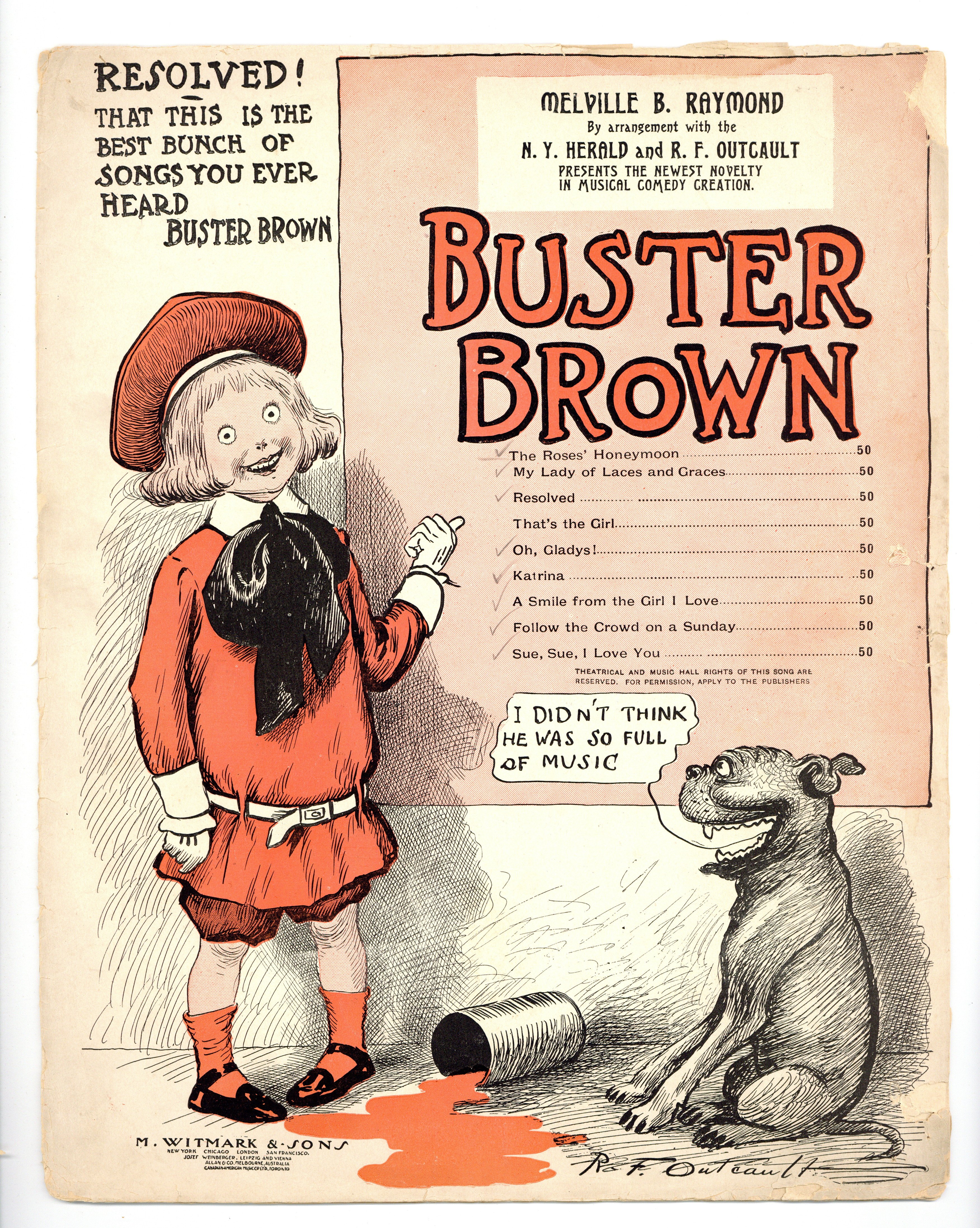 Buster Brown Sheet Music - The Roses' Honeymoon. Cover by R. F. Outcault. 11" x 13.75", 8 pages, B&W. Cover price $0.50.