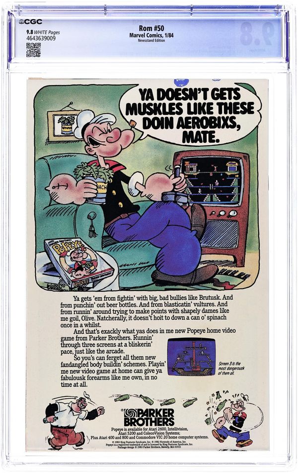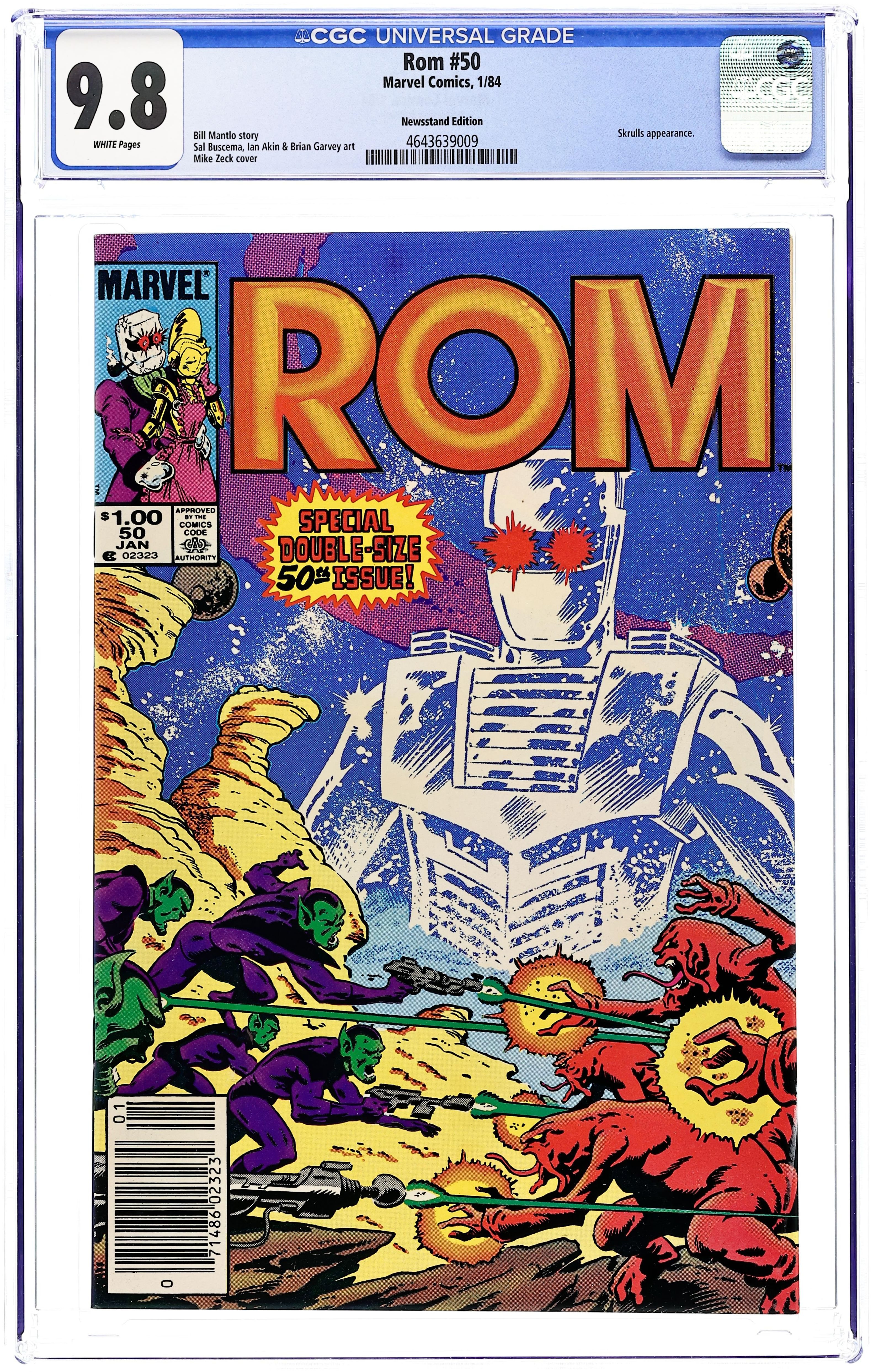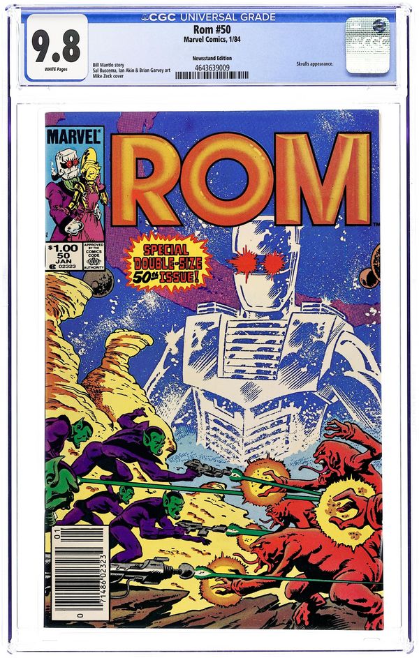 Newsstand Edition. Special double-size 50th issue. Story by Bill Mantlo. Art by Sal Buscema and Akin Garvey. Rom and Starshine are trapped in a shadow dimension and must find a way to return to Earth and prevent the Dire Wraiths from accomplishing their malevolent plans. Witness a startling transformation in Starshine that leaves the Earth woman forever changed. And, a cadre of alien Skrulls arrive in Clairton. What business do the enemies of the Fantastic Four have in Rom's adopted home? Plus, included are bonus posters with art by Richard Konkle and featuring Rom as well as Hybrid one of Rom's deadliest enemies. A tribute for those who have fallen including Steve Jackson, Torpedo, Terminator, Rom's own humanity, and others. A gallery of the heroes who have stood beside Rom including Dr. Strange, Namor, the X-Men. Power Man and Iron Fist, the Soviet Super-Soldiers, and the Fantastic Four. A gallery featuring Rom's arch foes, the horrible denizens of the Dark Nebula known as the Dire Wraiths. And finally the Spaceknights of Galador. Heroes die and the status-quo changes. This one has it all. 48 pages. Cover price $1.00.