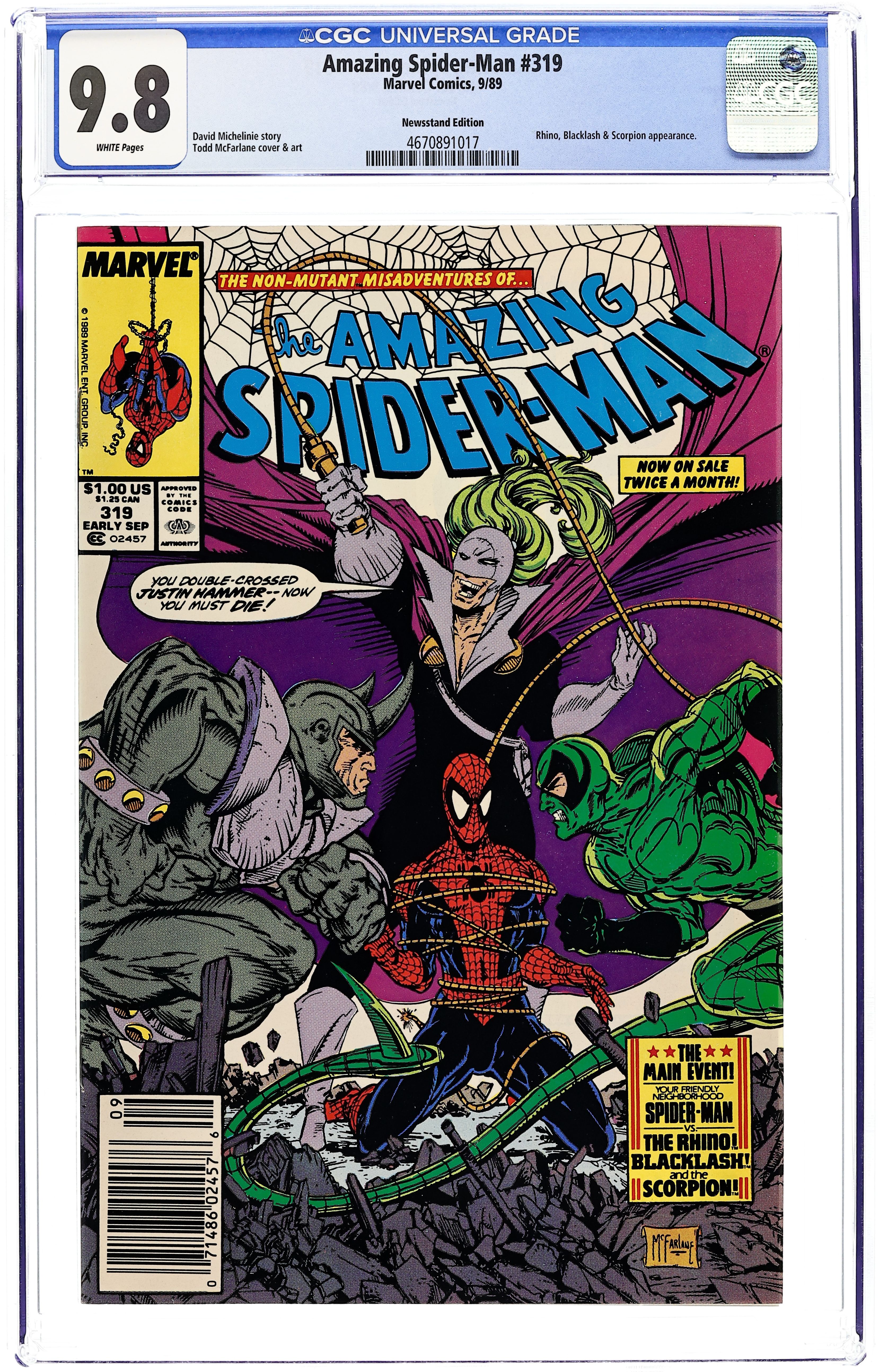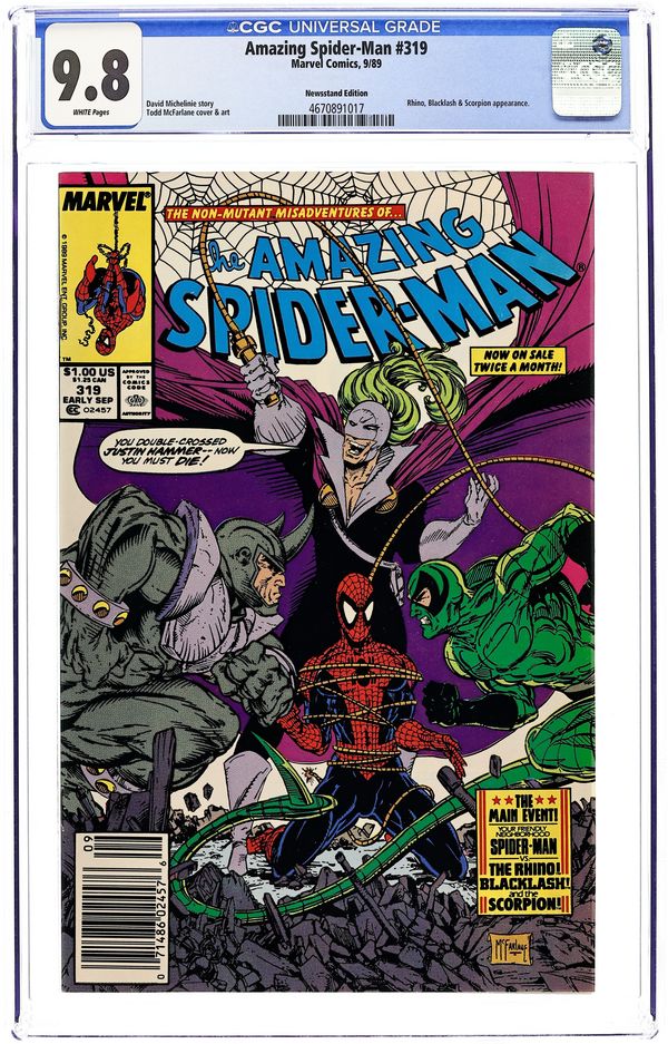 Newsstand Edition. "The Scorpion's Tail of Woe!" Part 2 of 2. Script by David Michelinie. Art by Todd McFarlane. Cover by Todd McFarlane. The Scorpion has a problem...and it's not the Amazing Spider-Man! The pointy-tailed villain double-crossed Justin Hammer last issue! And now the repercussions are on the way courtesy of Blacklash and the Rhino! Near the site of the World's Fair in Flushing Meadows, Hammer's newest mercenaries catch up with Spidey and the Scorpion! And the multi-faceted free-for-all begins! How many bad guys will the web-slinger have to beat? Cameo appearances by Mary Jane Watson, Harry Osborn, and Liz Osborn. (Note: The Amazing Spider-Man title was published bi-monthly for the next 8 issues.) 36 pages. Cover price $1.00.