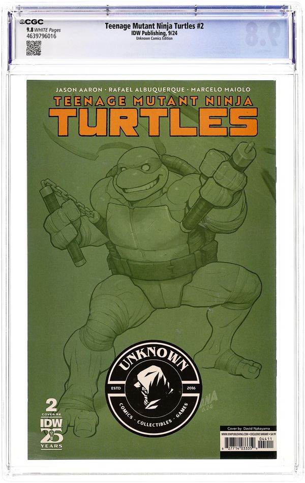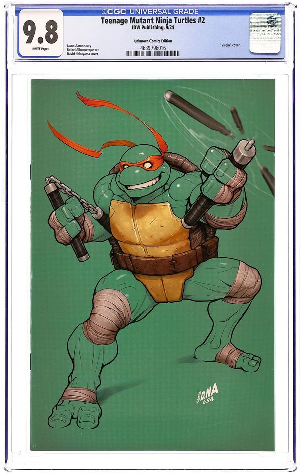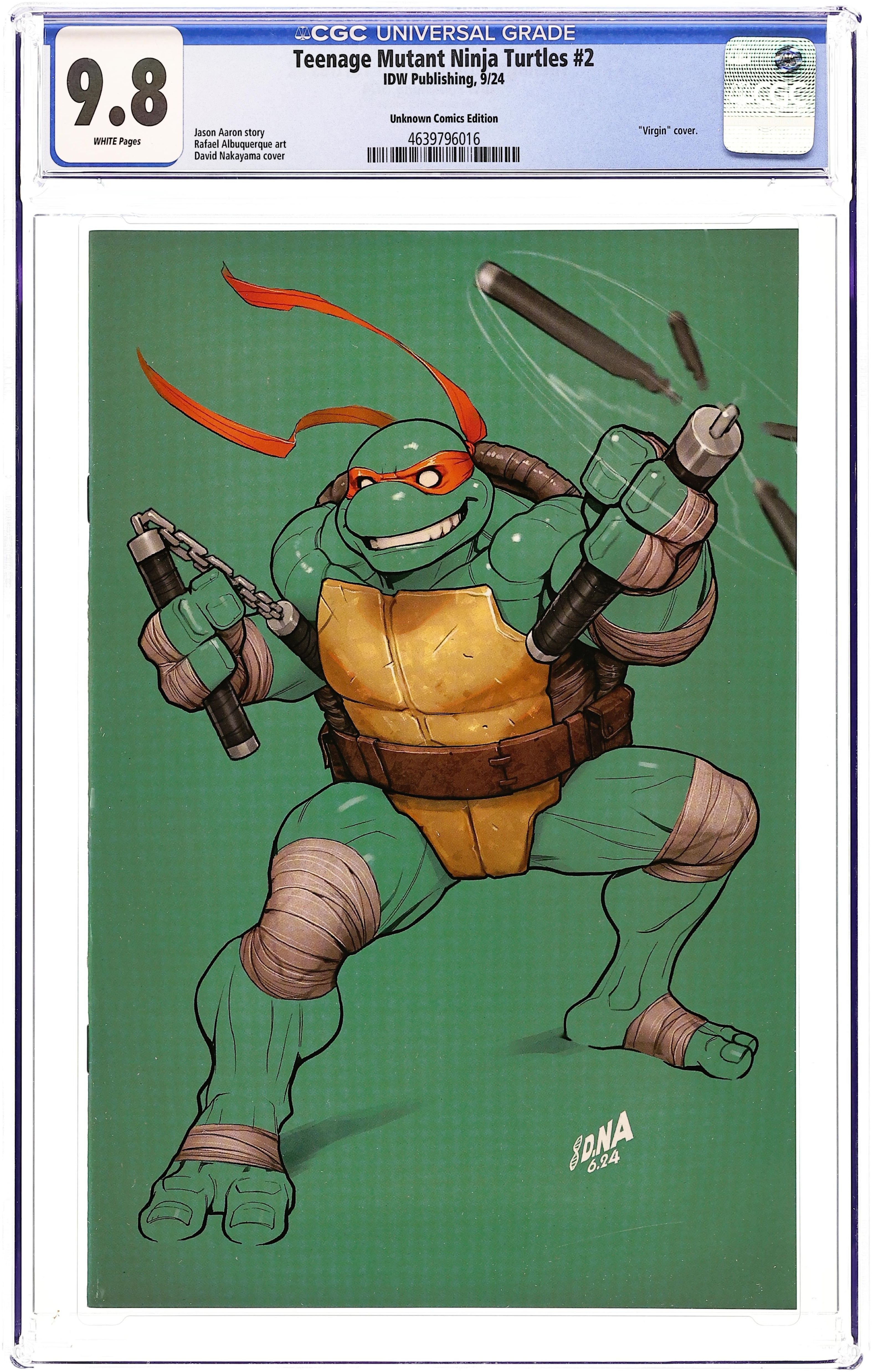 Unknown Comic Books Exclusive Virgin Cover by David Nakayama. Written by Jason Aaron. Art by Rafael Albuquerque. Michelangelo is living in Tokyo, where he's become a big TV star. Its a pretty cool life, full of fame and fortune, but if he's being honest, Mikey misses his brothers and the sense of purpose they had together. Well, in a classic case of be careful what you wish for, that old life looks like its coming to find him when ninjas show up in his apartment armed to the teeth! Continuing the all-new ongoing series from writer Jason Aaron (Action Comics, Thor), this time joined by Detective Comics and American Vampire artist Rafael Albuquerque, this spotlight story on everyone's favorite jokester puts the second piece of the puzzle together for the future of TMNT. 28 pages, full color. Cover price $4.99.