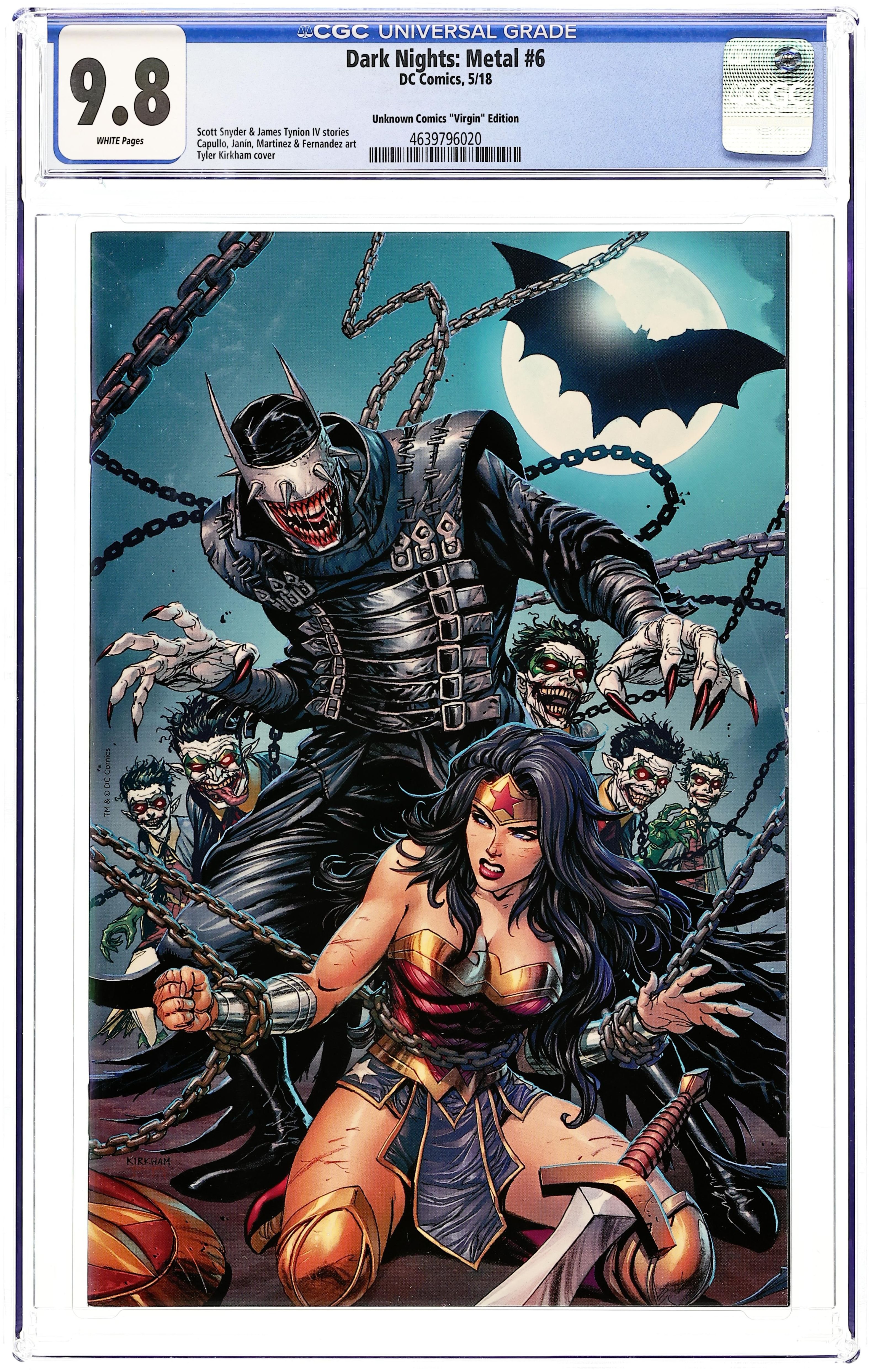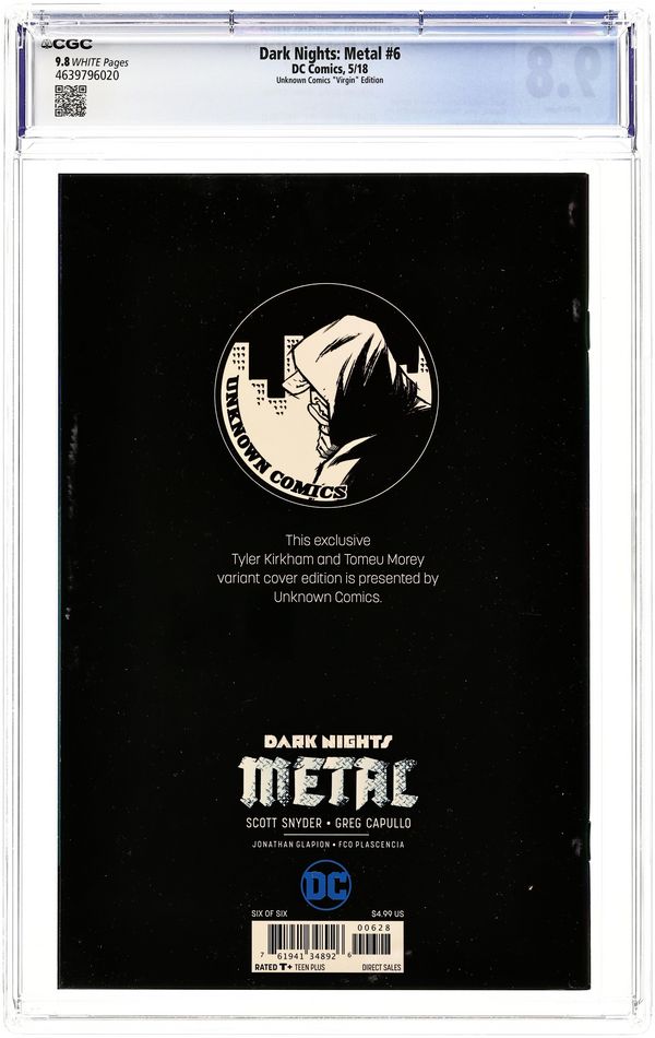 Unknown Comics Exclusive Virgin Cover by Tyler Kirkham. Written by Scott Snyder. Art by Greg Capullo and Jonathan Glapion. All roads lead…to darkness. In the devastating and epic conclusion to DC's cataclysmic event series, heroes from across the universe make their final charge into the unknown to battle the forces of the Dark Multiverse! Space and time, dreams and nightmares, all will collide - and what is left at the end will leave the DC Universe irrevocably changed! 48 pages, full color. Rated T+ Cover price $4.99.