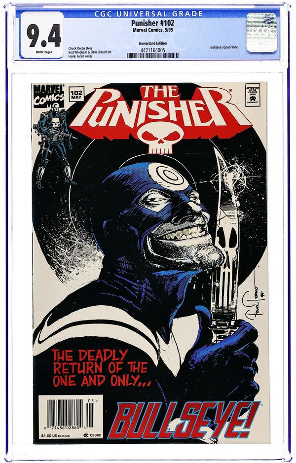 Newsstand Edition. Cover art by Frank Teran. Under the Gun, script by Chuck Dixon, pencils by Rod Whigham, inks by Pam Eklund; Bullseye protects Rosalie Carbone, the real Punisher faces off against Microchip's new Punisher. 2 of 4. 36 pgs. $1.50. Cover price $1.50.