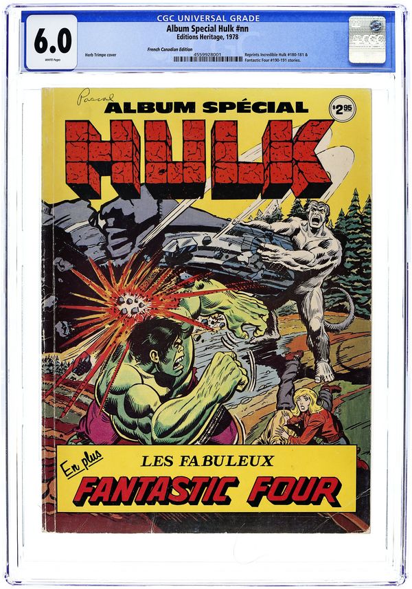 French Canadian Reprint Edition. Reprints Material from Incredible Hulk (1962 Marvel 1st Series) #180-181 and Fantastic Four (1961 1st Series). Reprints Cover from Incredible Hulk (1962 Marvel 1st Series) #180. Cover by Herb Trimpe. Story by Len Wein and Marv Wolfman. Art by Herb Trimpe, Sal Buscema, and Tony DeZuniga. Squarebound. 7 3/4" X 10 3/8".