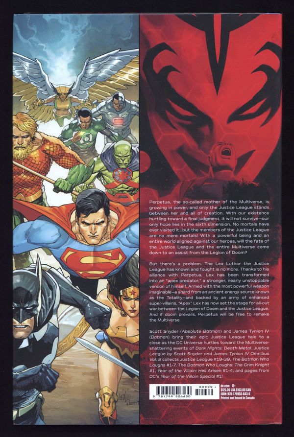 Volume 2 - 1st printing. Collects Justice League (2018-2022 DC) #19-39, The Batman Who Laughs (2019 DC) #1-7, The Batman Who Laughs: The Grim Knight (2019 DC), DC's Year of the Villain (2019 DC), and Year of the Villain: Hell Arisen (2019 DC) #1-4. Written by Scott Snyder, James Tynion IV, and Jorge Jimenez. Art by Juan Albarran, Jim Cheung, Steve Epting, Javi Fernandez, Jock, Jorge Jimenez, Francis Manapul, Howard Porter, Bruno Redondo, Daniel Sampere, and Eduardo Risso. Cover by Jorge Jimenez. Back Cover by Leinil Yu and Steve Epting. Perpetua, the so called mother of the multiverse, is growing in power, and only the Justice League stands between her and all of creation. With our existence hurtling toward a final Judgment, it will not survive – our only hope lies in the sixth dimension. No mortals have ever visited it...but the members of the Justice League are no mere mortals! With a powerful being and an entire world aligned against our heroes, will the fate of the Justice League and the entire Multiverse come down to an assist from the Legion of Doom? But theres a problem. The Lex Luthor the Justice League has known and fought is no more. Thanks to his alliance with Perpetua, Lex has been transformed into an apex predator, a stronger, nearly unstoppable version of himself. Armed with the most powerful weapon imaginable – a shard from an ancient energy source known as the Totality – and backed by an army of enhanced super-villains. Apex Lex has now set the stage for all-out war between the Legion of Doom and the Justice League. And if Doom prevail, Perpetua will be free to remake the Multiverse. Scott Snyder and James Tynion IV bring their epic Justice League tale to a close before Dark Knights: Death Metal. Hardcover, 8 1/2-in. x 11-in., 896 pages, full color. Teen+ Cover price $125.00.