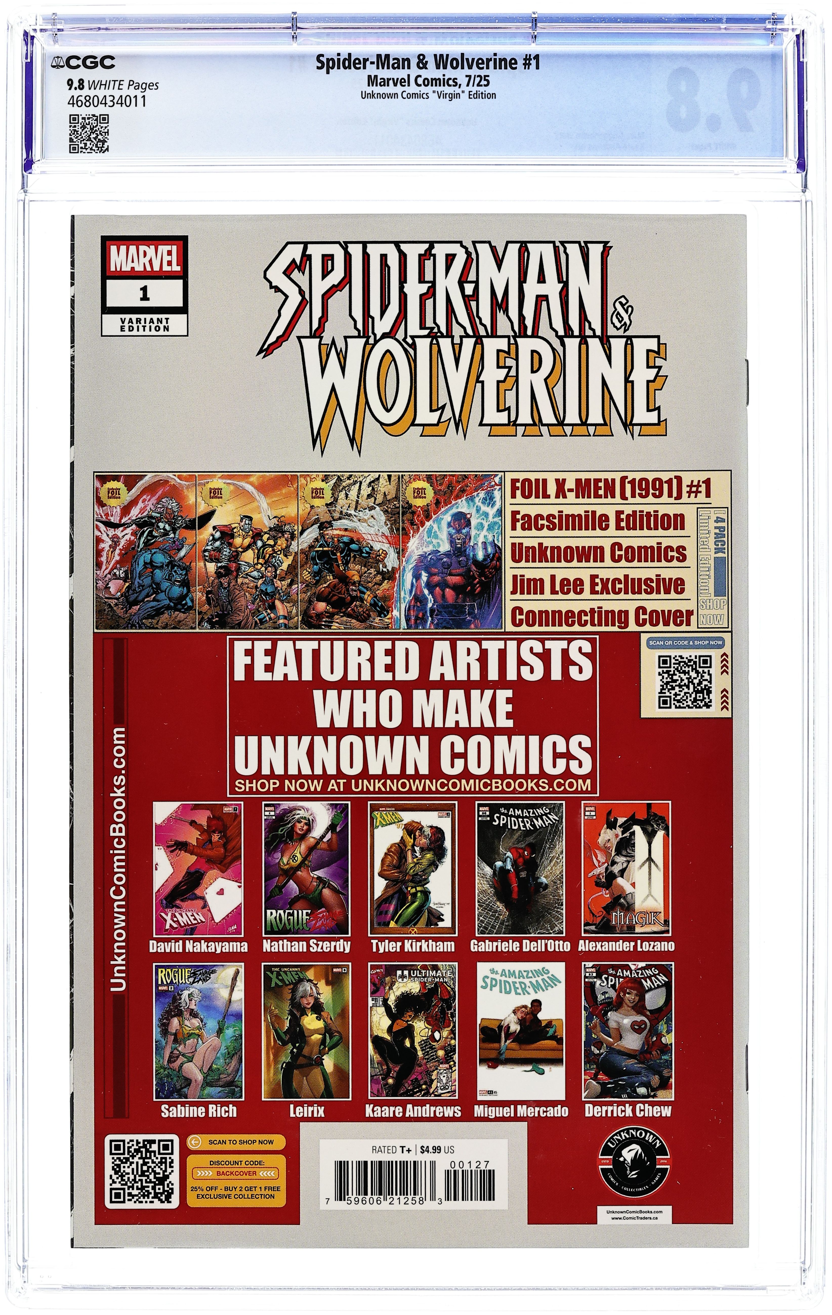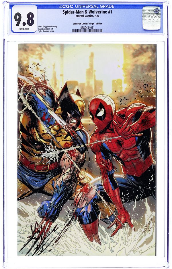 Unknown Comics and Comic Traders Exclusive Virgin Cover by Tyler Kirkham. Written by Marc Guggenheim. Art by Kaare Andrews. THWIKT! Did you hear that? That sound can only mean one thing: two of your favorite Marvel heroes doing what they do best! With great power, there must also come…the best there is! SPIDER-MAN & WOLVERINE team up for the biggest adventure in Marvel comics! Who or what is targeting this unlikely duo, and what can they do to stop it? Get ready for a nonstop thrill ride of big villains, bigger threats and even bigger surprises as LOGAN and PETER PARKER team up against the machinations of a plot too big for just one hero… 32 pages, full color. Rated T+ Cover price $4.99.