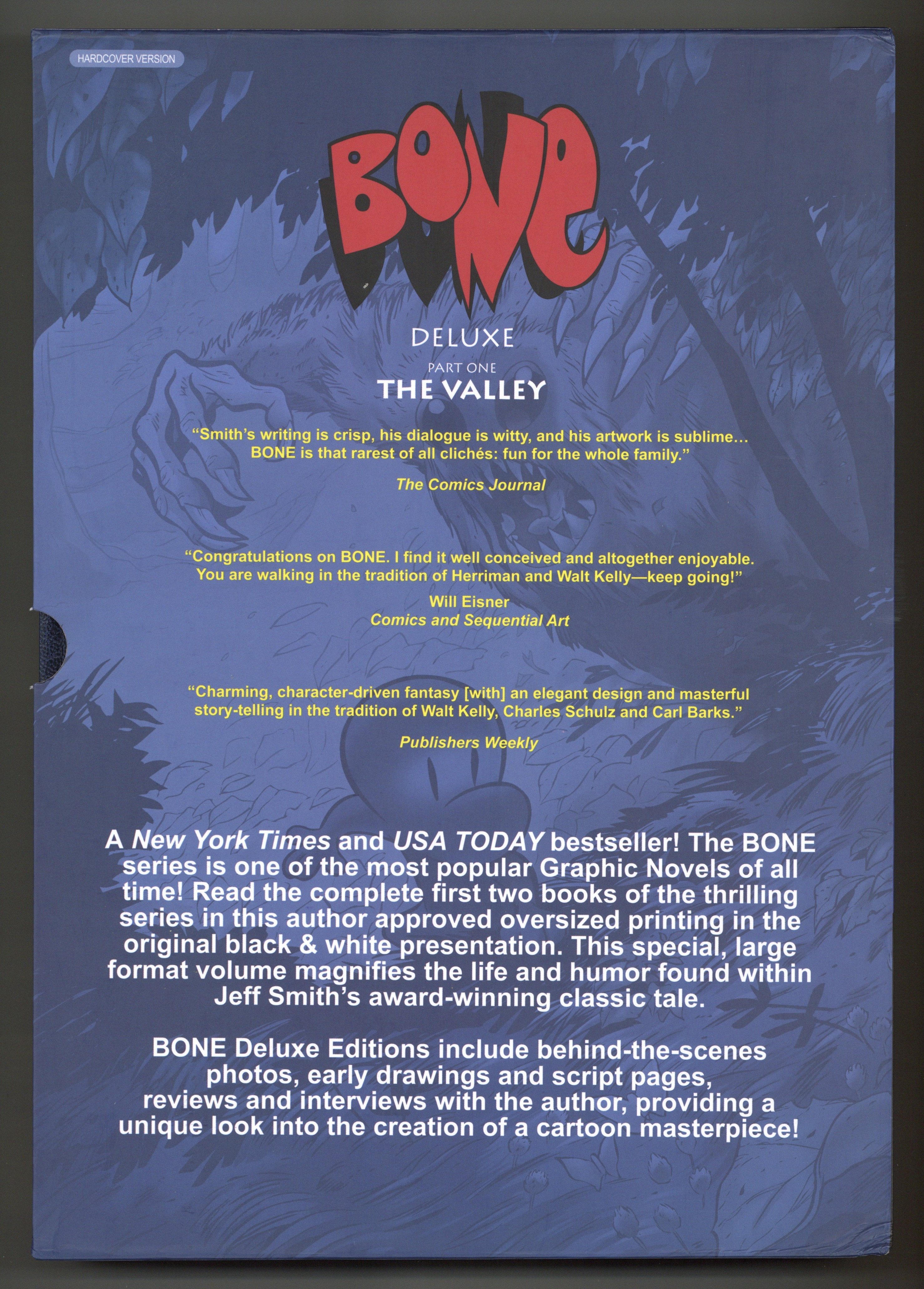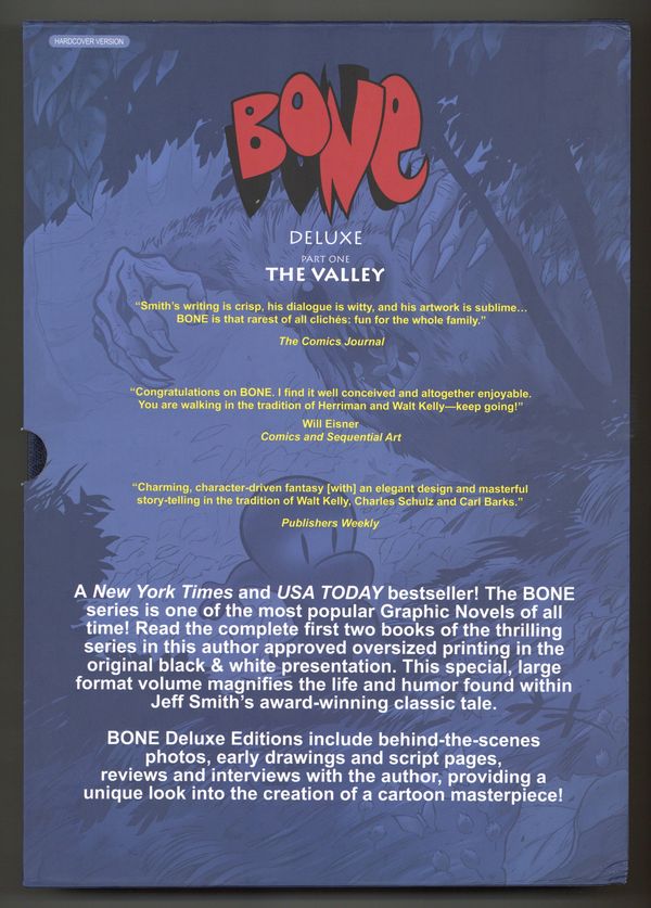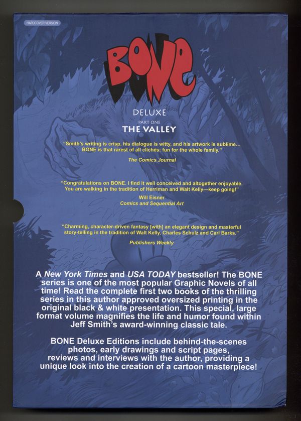 Hardcover Edition. Kickstarter Exclusive. Volume 1 - 1st printing. "The Valley!" Collects Bone (1991-2004) #1-11. Story and art by Jeff Smith. Cartoon Books announces the next release of the deluxe library editions with: Part One: The Valley. This beautiful, oversized book, BONE Deluxe Edition Part One: The Valley, will be 352 pages comprising volumes 1 and 2 of the BONE graphic novels: "Out from Boneville" and "The Great Cow Race". These deluxe collections will be 12.5" x 8.75" hardcover trades housed in a full color slipcase. The interiors will be black and white as originally presented, but larger than they have ever been printed before! Bonus material includes all illustrated vignettes, photos, early scripts, drawings, articles, reviews and additional pages that appeared in the original graphic novels, as well as a color gallery of all the original covers of the issues contained in this first ultimate edition of BONE! Just like in our last Deluxe Library Edition titled THORN: The Complete Proto-BONE College Strips from 1982-1986, there will be a full color bonus section called "Tales from the Inkwell", a behind the scenes look at the journey of this collection, BONE and Cartoon Books. BONE tells the story of three misfit cousins - Fone Bone, Phoney Bone and Smiley Bone, who are run out of Boneville and find themselves lost in a vast uncharted desert. They make their way into a deep, forested valley filled with wonderful and terrifying creatures. With the help of the mysterious Thorn, her tough-as-nails Gran'ma Ben and the Great Red Dragon, the boys do their best to survive in the middle of brewing trouble between the valley's denizens. It will be the longest - but funniest - year of their lives! BONE Deluxe Edition Part One: The Valley, will be released July 2025. Hardcover (with Slipcase), 8 3/4-in. x 12 1/2-in., 352 pages, full color. Cover price $100.00.