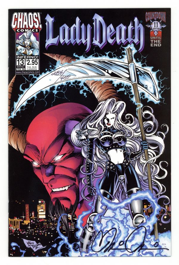 $38.00Dynamic Forces Signed Edition - Limited to 450 Signed Copies. Signed and numbered by Brian Pulido. Includes Certificate of Authenticity from Dynamic Forces. Cover by Mike Deodato Jr. "Inferno!" [Part 1], script by David Quinn, art by Mike Deodato Jr.; After 400 years, Lady Death is once again able to walk the earth and returns to her hometown in Germany; In their human guises, Lucifer and his allies begin to cement their hold over the city of Las Vegas; Michael watches over the human, Hope, little realizing that Leviatha is getting closer to her by pretending to be her friend; When Hope is attacked by the horsemen of the apocalypse, she manifests Lady Death; Michael is recalled to Heaven by Gabriella. 36 pgs., full color. $2.95. Cover price $2.95.