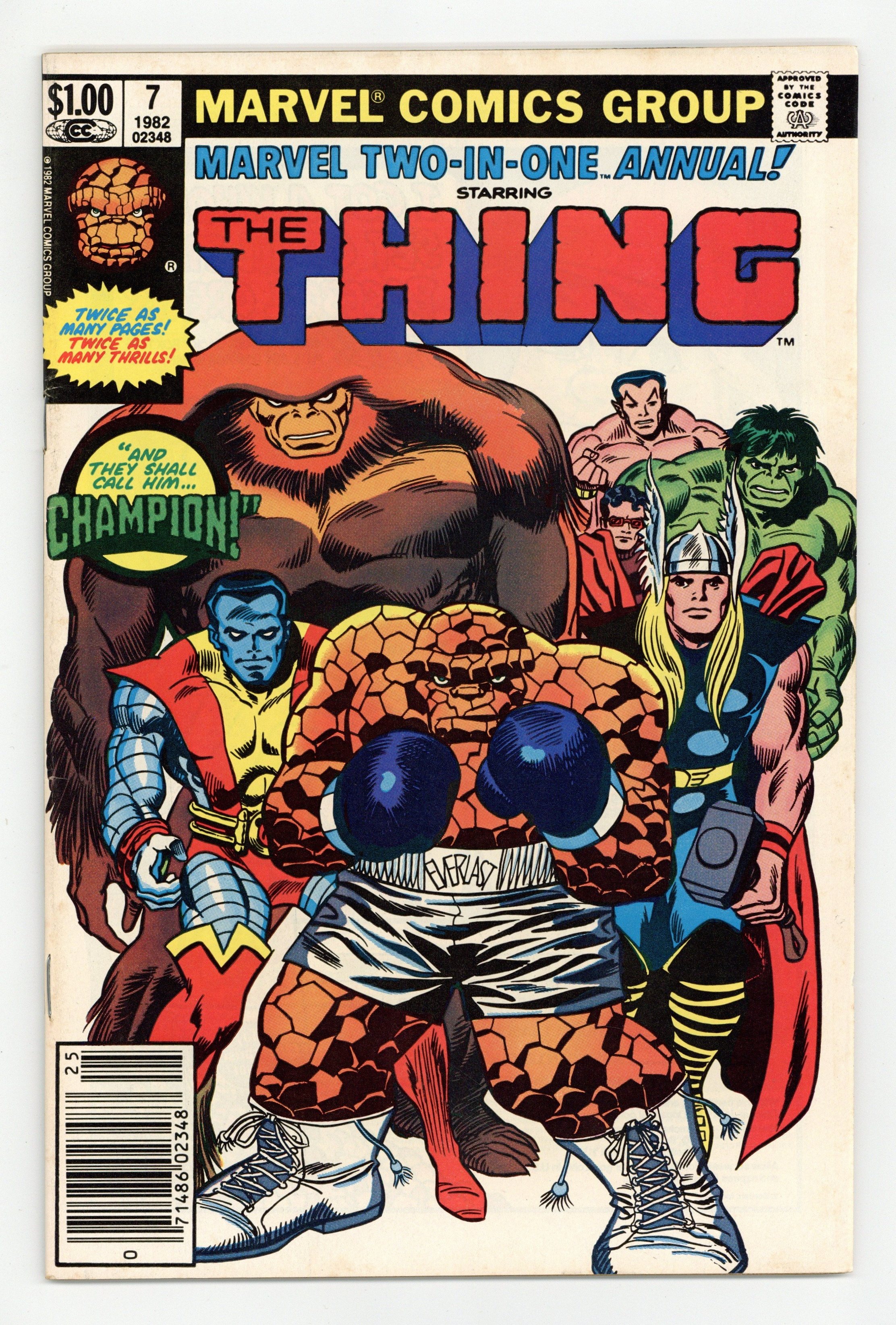 $19.75Newsstand Edition. "Champion!" Guest-starring Thor, Hulk, Sub-Mariner, Colossus, Sasquatch, Doc Samson, and Wonder Man. Cameos by the Fantastic Four, Avengers, and X-Men. Story by Tom DeFalco. Art by Ron Wilson, Camp Esposito, Giacoia, Dan Green, and Chic Stone. In arguably the best Thing story of all, a cosmic immortal known as the Champion, a being of nigh immeasurable strength whose existence is defined by physical contest, arrives on Earth and wishes to test his mettle against the mightiest heroes this planet has to offer. If they do not fight, this powerful being will destroy the Earth. After readily dispatching all contenders, the last man standing is Aunt Petunia's favorite nephew. But, can even the strongest member of the Fantastic Four hope to defeat an Elder of the Universe? 48 pages.