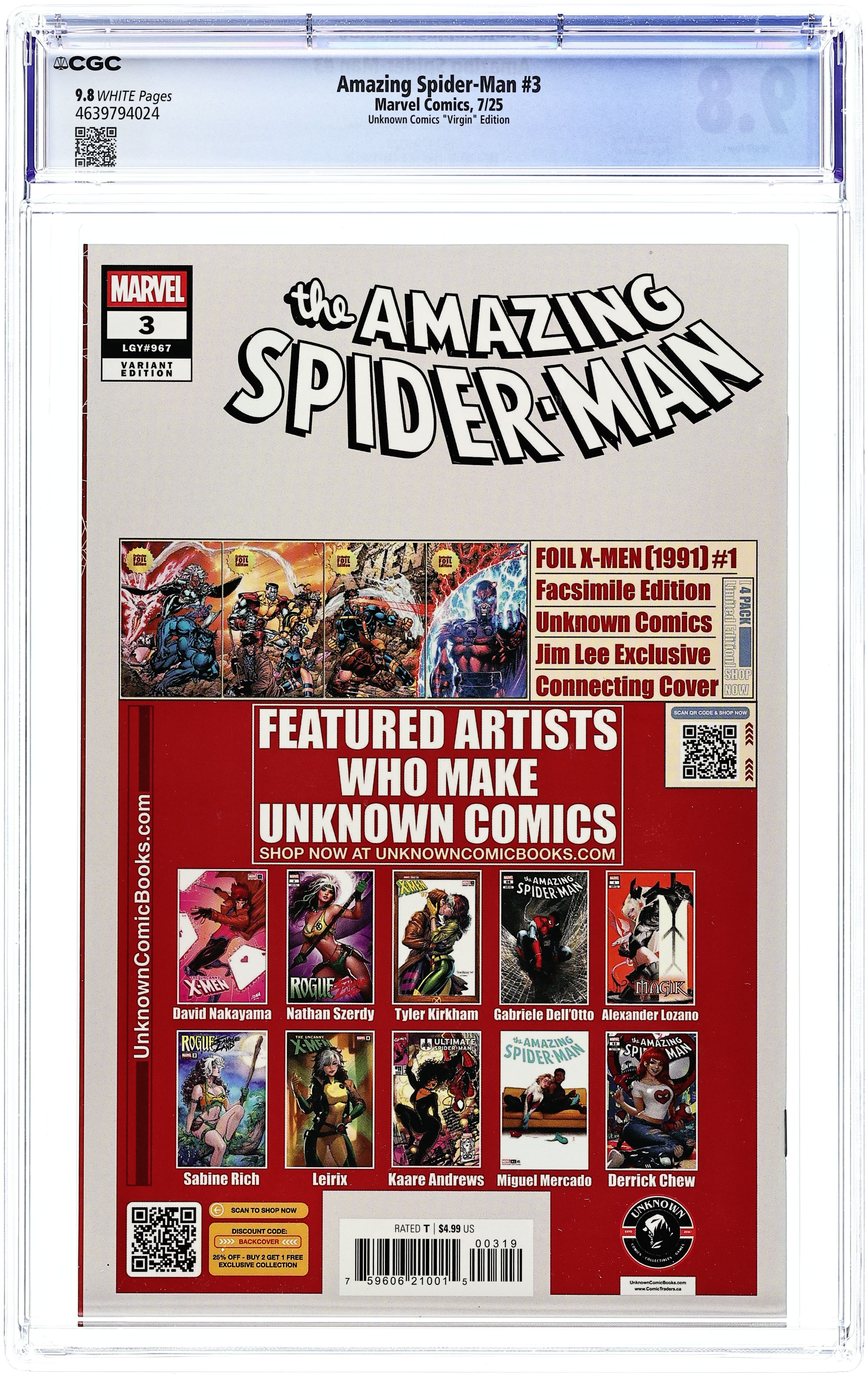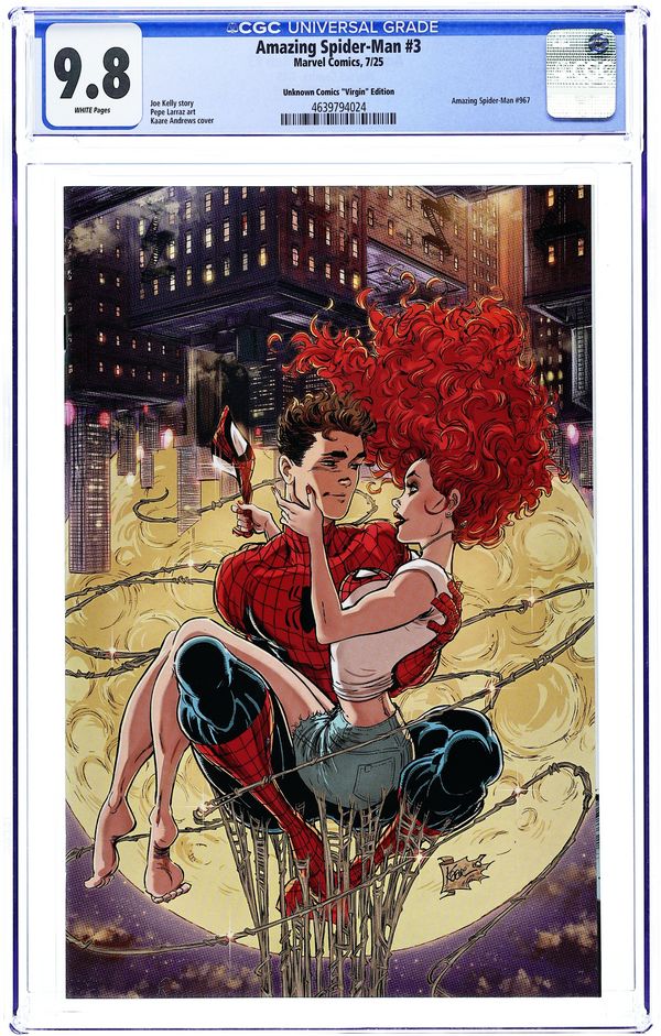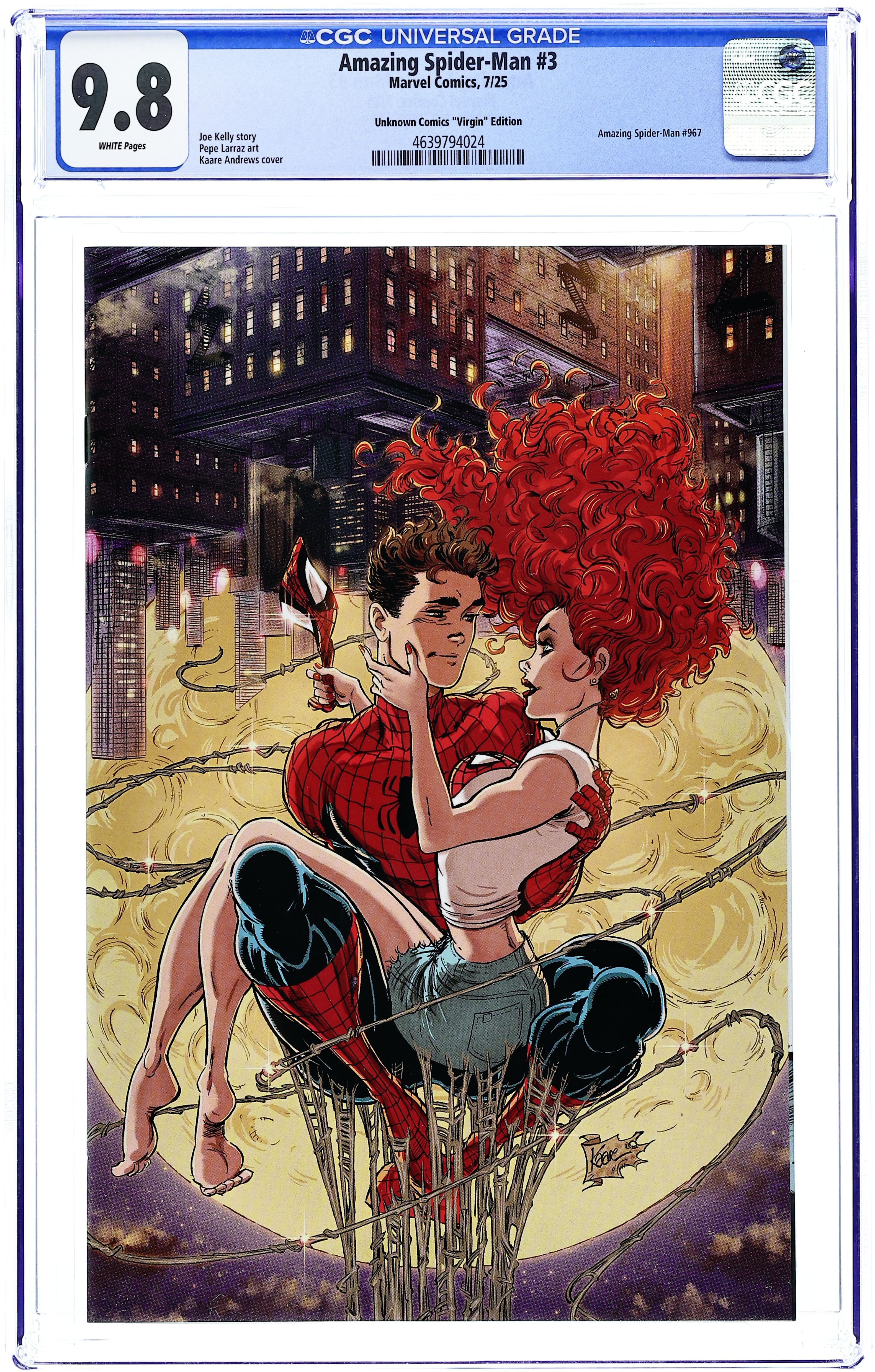 Unknown Comics Exclusive Virgin Cover by Kaare Andrews. Written by Joe Kelly. Art by Pepe Larraz. PUMPKIN BOMB PROBLEMS! Past and present collide sending Spider-Man spinning OUT OF CONTROL - just when an old foe obsessed with him gets the sword-stabbing jump on Peter and his main squeeze, Shay Marken! Can the last remaining ally still in Spidey's corner, the GREEN GOBLIN, Norman Osborn, cure Peter before his entire life implodes?! 32 pages, full color. Rated T