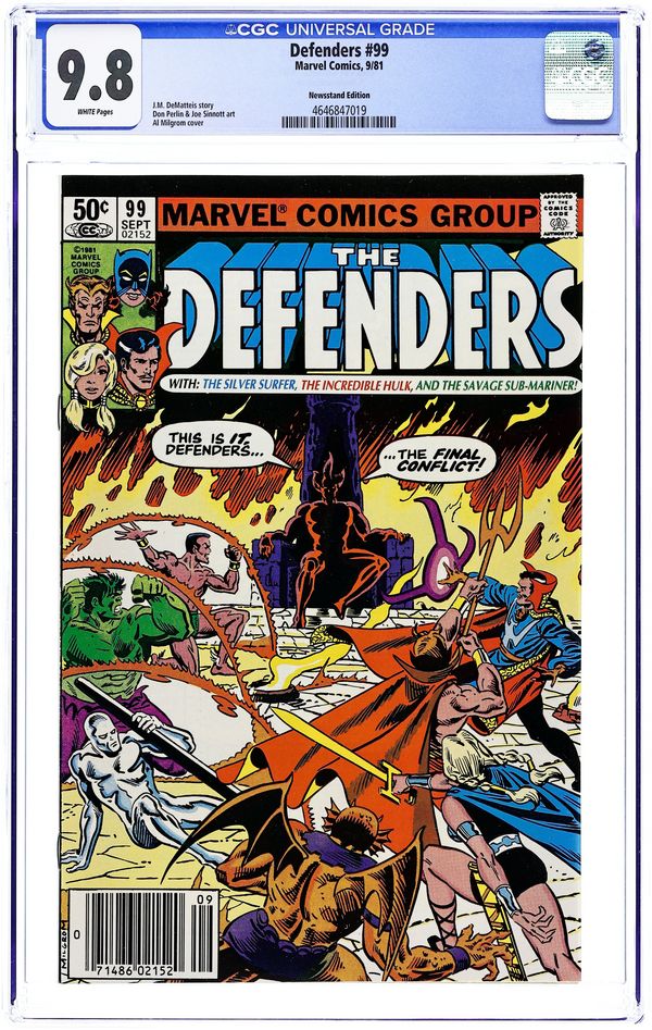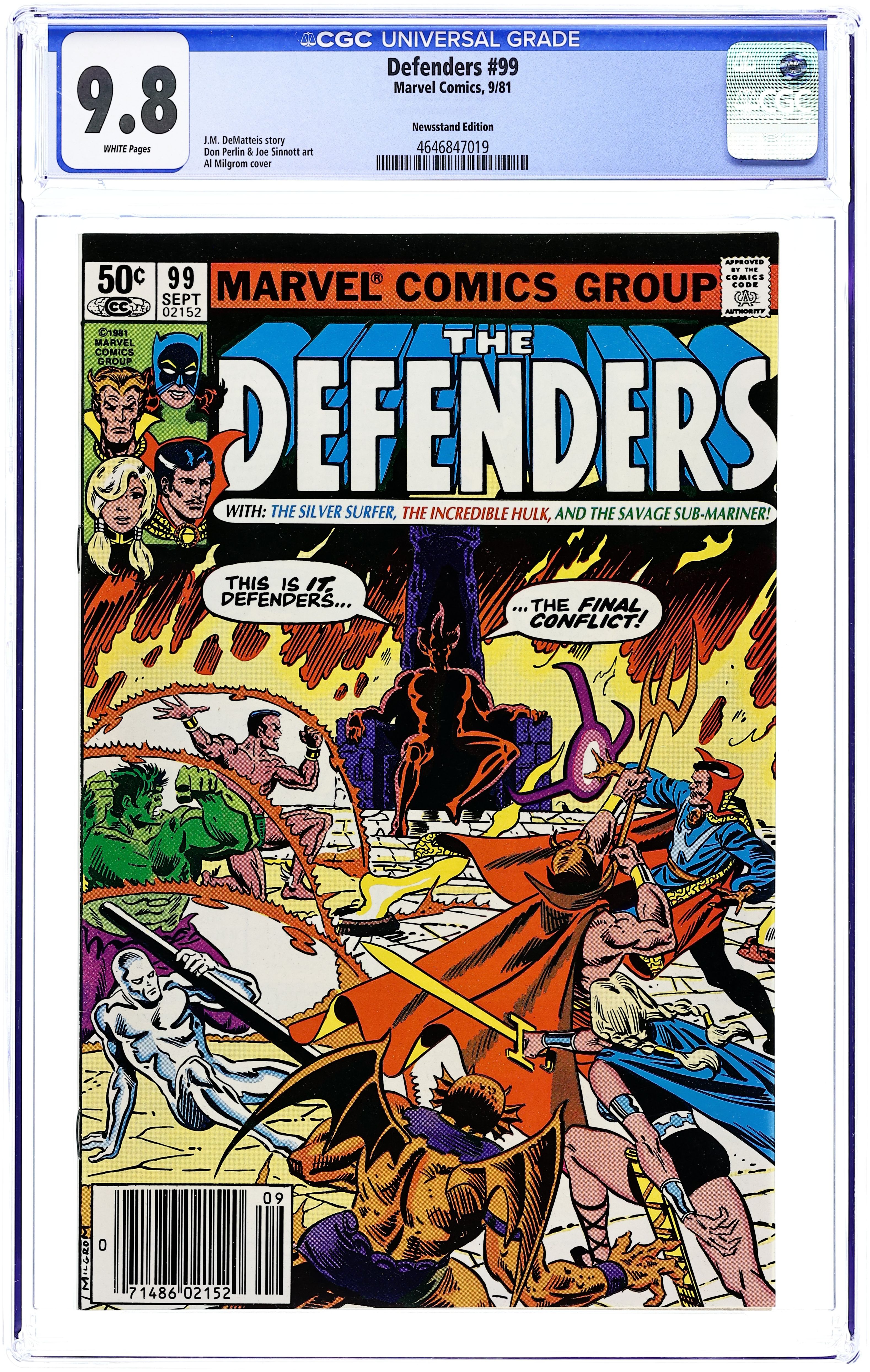 Newsstand Edition. Cover art by Al Milgrom. The Final Conflict?, script by J. M. DeMatteis, pencils by Don Perlin (breakdowns) and Joe Sinnott (finished art), inks by Joe Sinnott; Mephisto reveals that Eternity's missing parts stretched the fabric of the multiverse, and so does Dr. Strange Teleportation spell, he created the 6 fingered hand to make Dr. Strange use the spell over and over. Hot-Tempered Triumph! Hostess Twinkies ad with the Human Torch. 36 pgs. $0.50. Cover price $0.50.
