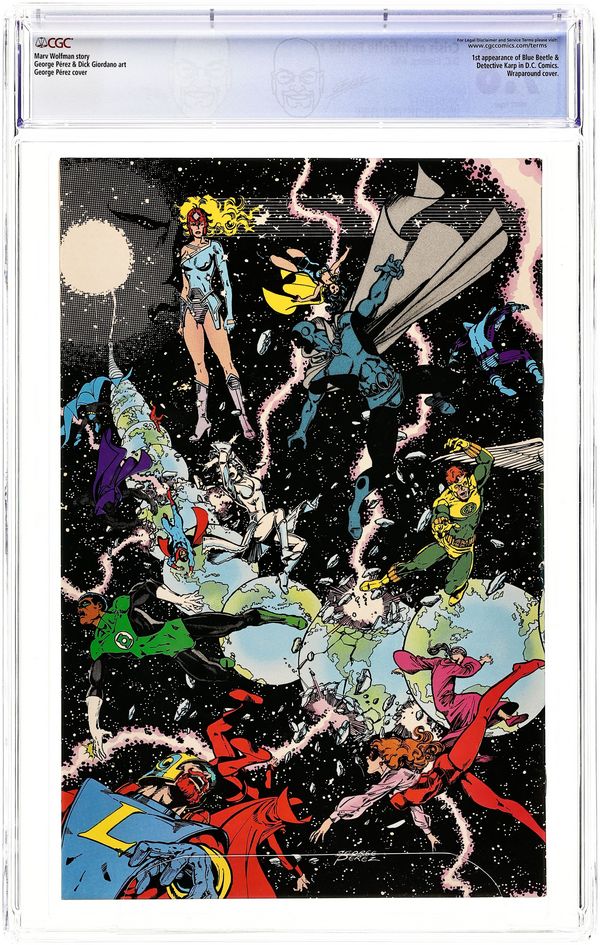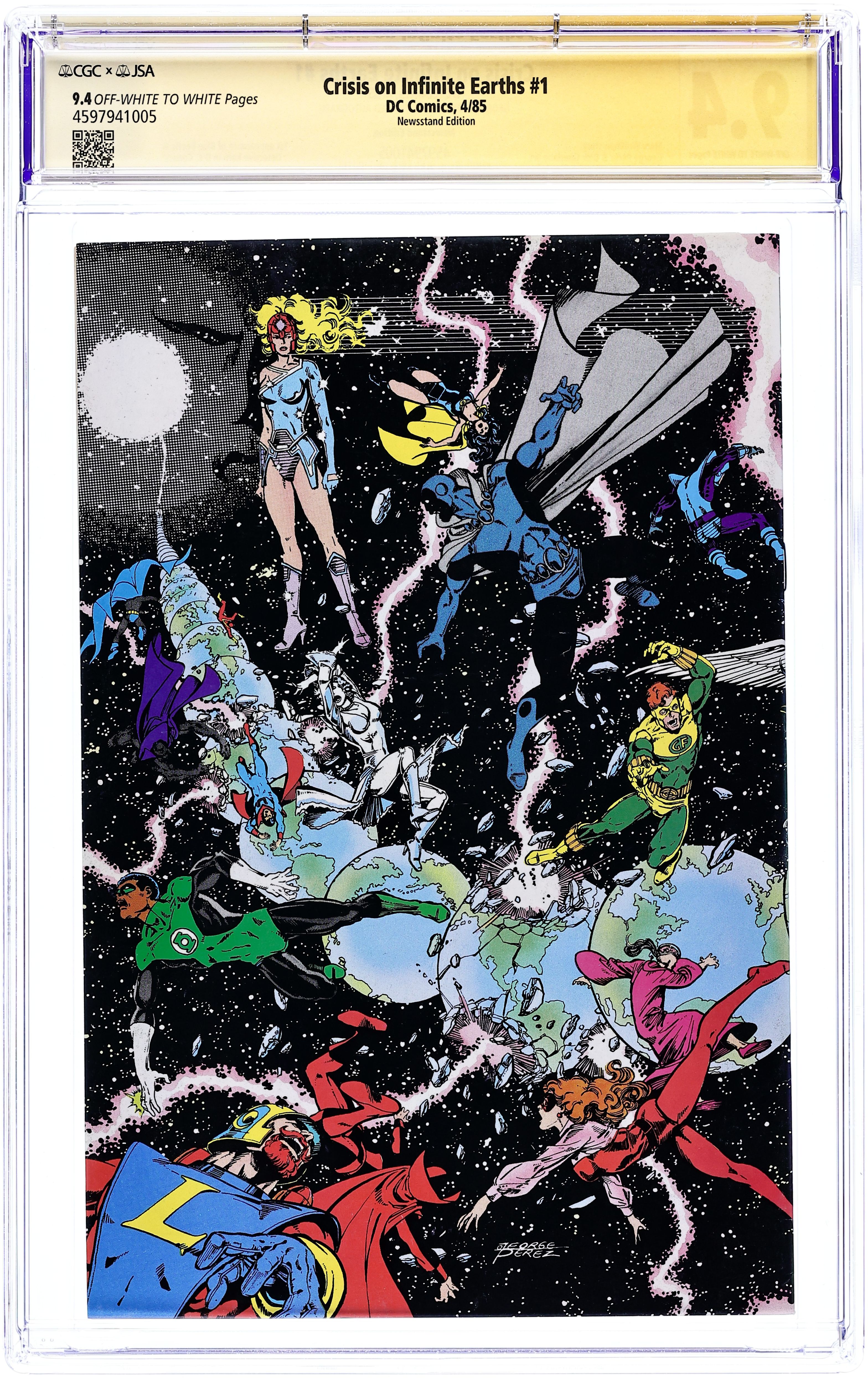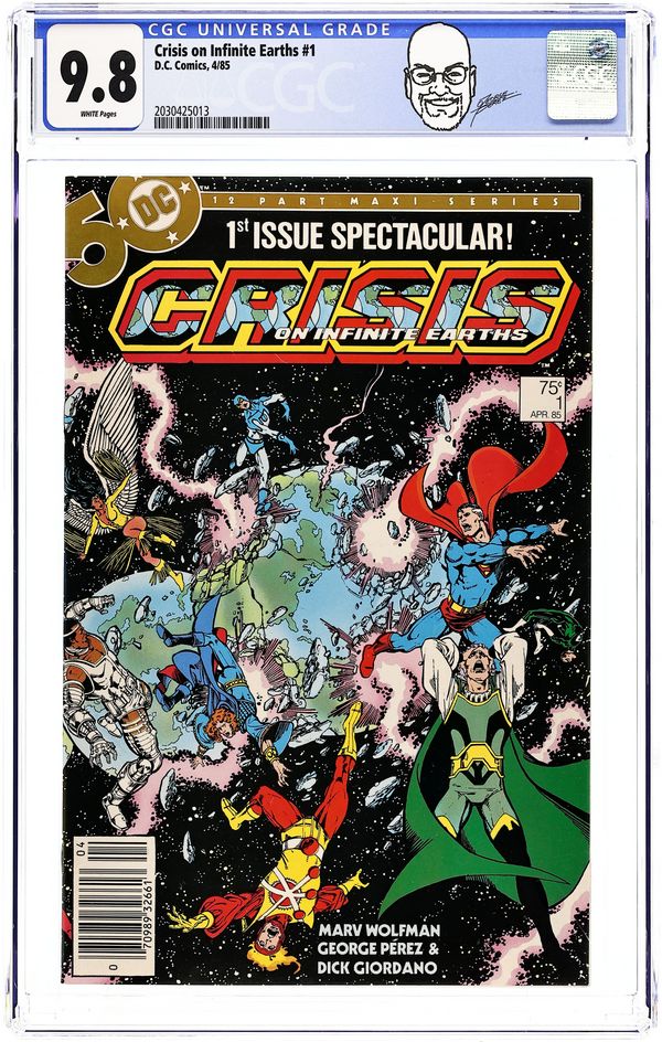 Newsstand Edition. "The Summoning!" Written by Marv Wolfman. Art by George Perez and Dick Giordano. This is it, the biggest, and arguably most important, event in the history of the DCU. A wave of unstoppable destructive force is sweeping across the multiverse and indiscriminately destroying everything in its path. Nothing seems able to stop it. The Crime Syndicate of Amerika (evil versions of the JLA) of Earth-3 die trying, along with their world. Batman receives an ominous warning from the Flash. Weather and natural disasters are out of control. An eclectic group of heroes and villains from around the multiverse are assembled to halt the death and destruction, and the being known as the Monitor may be the only one who can help them. 1st appearance of Alexander Luthor. Featuring the deaths of the Crime Syndicate of Amerika and Lex Luthor of Earth-3. NOTE: What can I say about "Crisis" accept that it's epic, meaningful, engrossing, and grand in scope. As an eleven year old comic fan, I remember being absolutely blown away by this story. Marv Wolfman and George Perez are truly masters of their craft. - Odinson, Lone Star Comics Archivist Cover price $0.75.