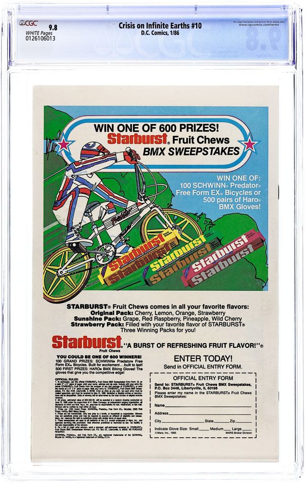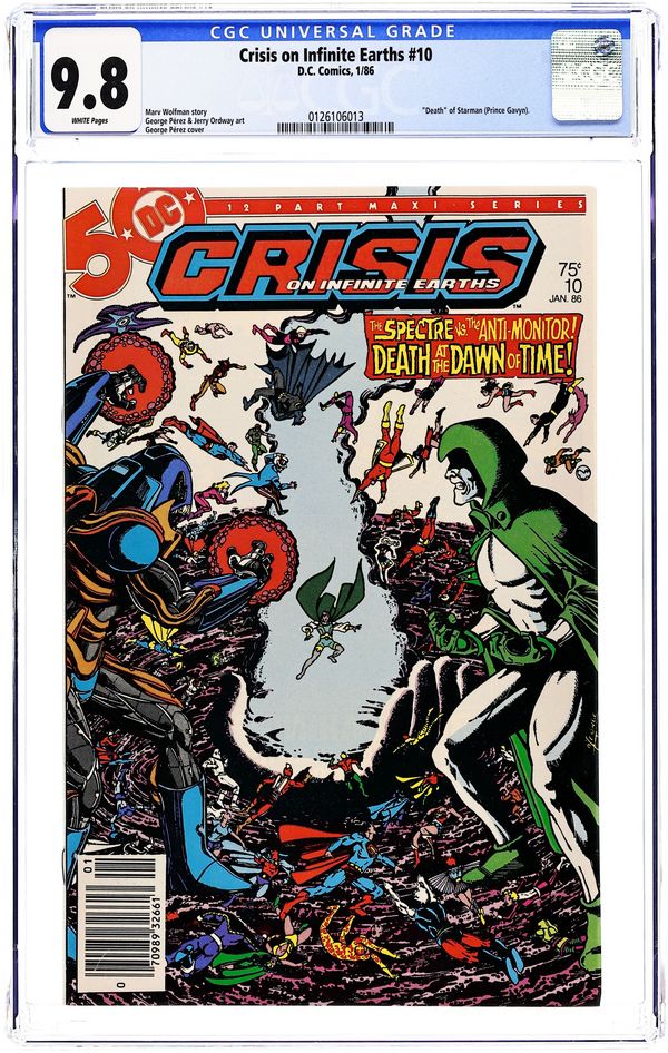 Newsstand Edition. "Death at the Dawn of Time!" Written by Marv Wolfman. Art by George Perez and Jerry Ordway. In an attempt to finally crush his enemies, the Anti-Monitor travels to the Dawn of Time. In a coordinated effort by the heroes and villains of the DCU, they try to prevent this killing blow, and fail. Now, only the spirit of vengeance known as the Spectre stands defiant against the total annihilation of everything. But does even this immeasurably powerful being possess enough power to stop the Anti-Monitor when the villain has added the strength of all the heroes to his own? This is the end of everything as we know it and nothing will ever be the same again, literally. Includes a look at the Monitor's Tapes. Featuring the death of Psi-Mon and the end of the multiverse. Cover price $0.75.