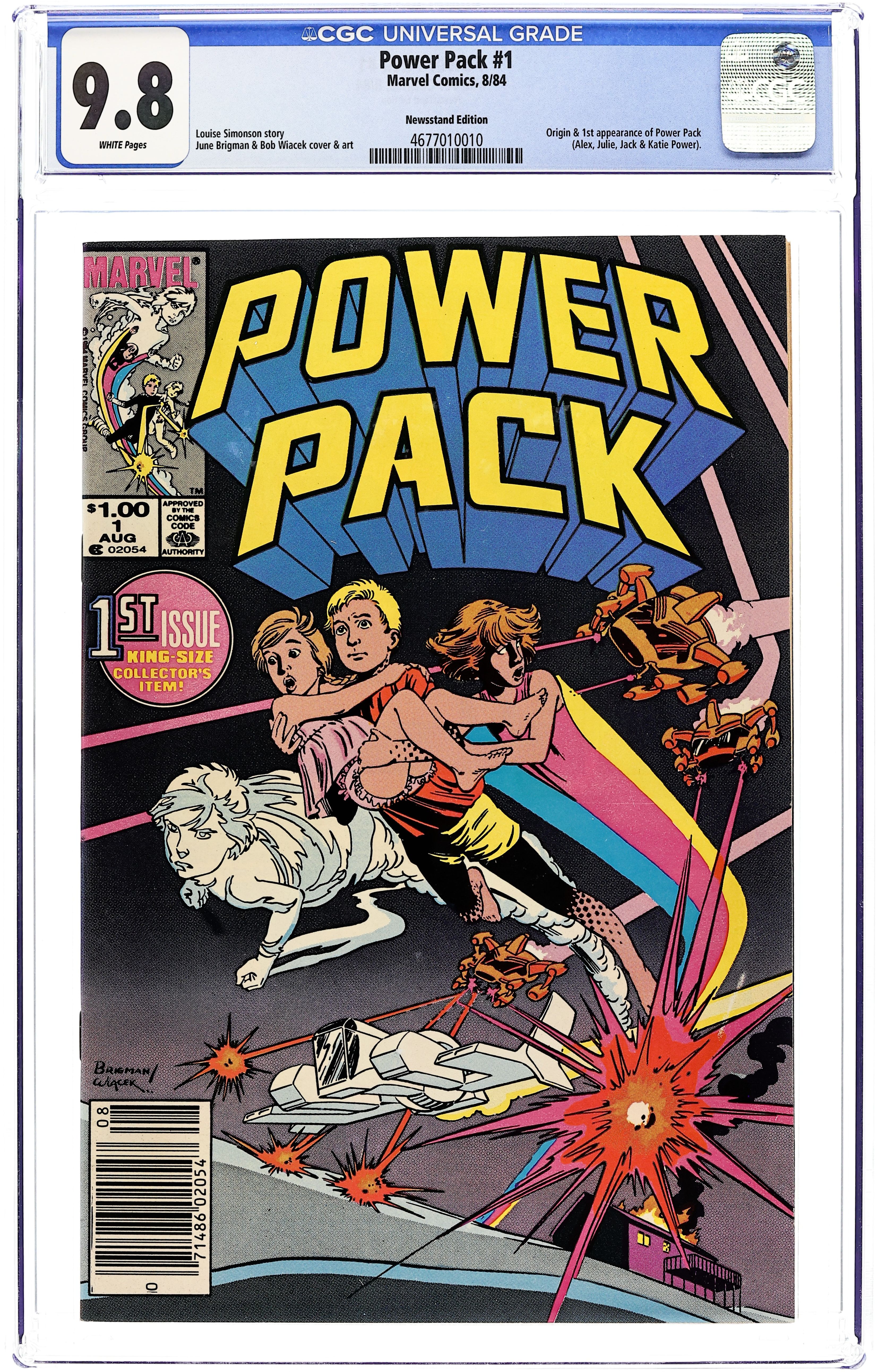 Newsstand Edition. Cover art by June Brigman and Bob Wiacek. Power Play, script by Louise Simonson, pencils by June Brigman, inks by Bob Wiacek; an alien called Whitey, under attack by Snarks, crash lands on Earth and gives super powers to four children. The Power Behind the Pack article, art by Walt Simonson. Origin and 1st appearance of Power Pack. 52-page giant. $1.00. Cover price $1.00.