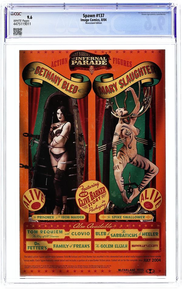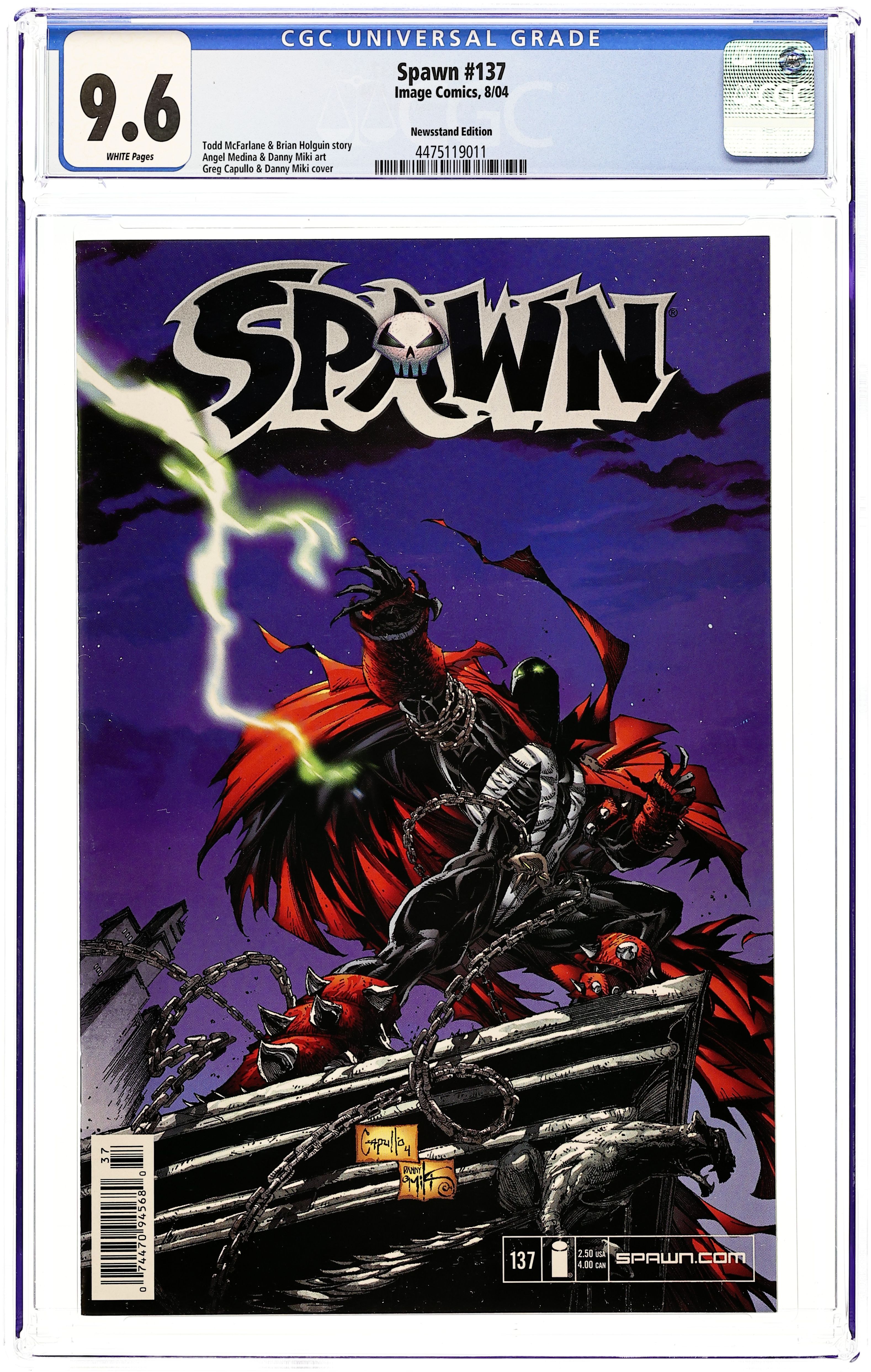 Newsstand Edition. (W) Brian Holguin and Todd McFarlane (P) Angel Medina (I) Danny Miki (Cover) Greg Capullo and Todd McFarlane FC. Monthly ongoing series In stores the week of August 27th. THE CONCEPT: Al Simmons, once the U.S. government's greatest soldier and most effective assassin, was mercilessly executed by his own men. Resurrected from the ashes of his own grave in a flawed agreement with the powers of darkness, Simmons is reborn as a creature from the depths of Hell. Disfigured, homeless and alone, this warrior now known as Spawn wanders the shadowy alleys of New York City in search of his past life. THIS ISSUE: "Mad Shadows, Part III." Spawn and Nyx race against time to unravel the mystery surrounding a bizarre rash of brutal murders. All the evidence seems to point to the existence of legendary monsters -- werewolves, zombies, vampires and ghouls -- that emerge from the shadows then disappear without a trace. Convinced that there is a flesh- and-blood face behind all this carnage, Spawn follows the trail to an unlikely and surprising source. 32 pp $2.50 Cover price $2.50.