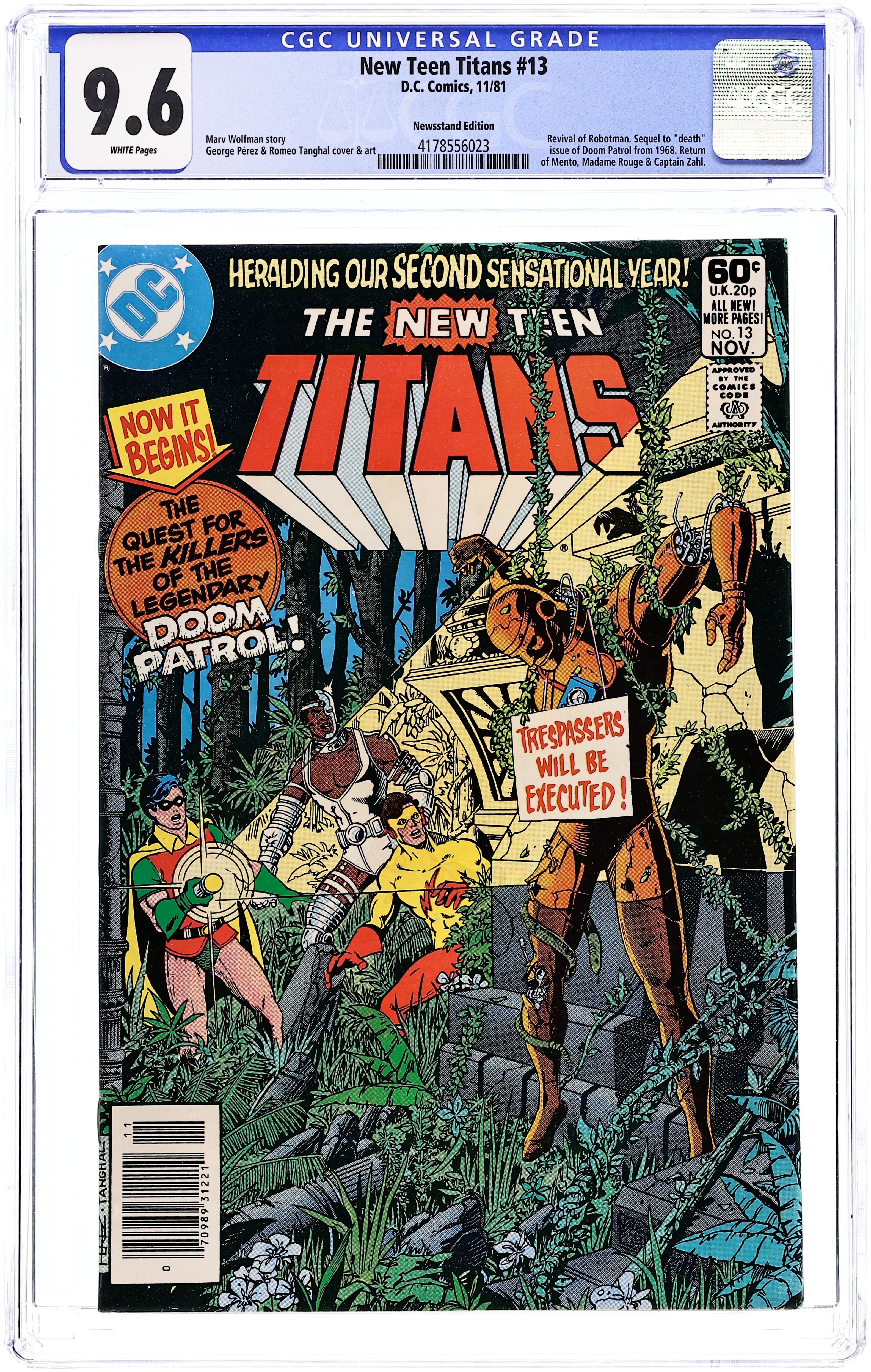Newsstand Edition. Robin, Cyborg, Kid Flash and Robotman are on Steve Dayton's trail in Uganda, while Starfire, Raven and Queen Hippolyta must contend with an enraged Changeling on Paradise Island in "Friends and Foes Alike!" Part 1 of 3, continued next issue. Script by Marv Wolfman, pencils by George Perez, inks by Romeo Tanghal. 27 pages of story. Perez/Tanghal cover. Cover price $0.60.