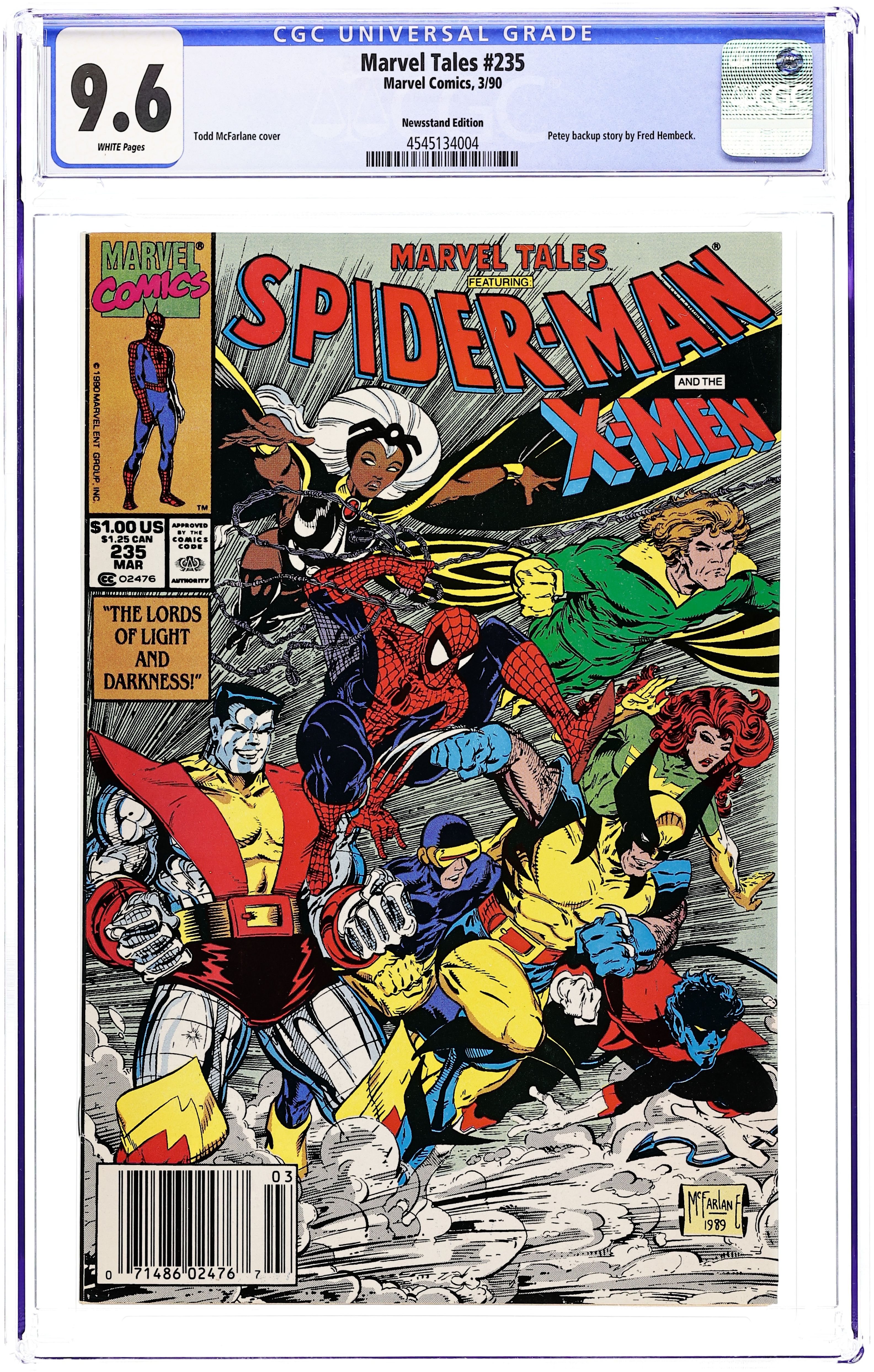 Newsstand Edition. Cover art by Todd McFarlane. The Lords of Light and Darkness! [Part 1], script by Chris Claremont (Co-plot), Bonnie Wilford (Co-plot), and Bill Mantlo (Co-plot; script), pencils by Sal Buscema, inks by Mike Esposito; Spidey and the X-Men are attending a secret airborne summit on man made mutation when their plane mysteriously goes down; reprinted from Marvel Team-Up Annual (Marvel, 1976 series) #1. Slay Ride, script and art by Fred Hembeck; A winter trick on Petey turns into an impromptu sled ride for J. Jonah Jameson. Spill the Beans--Petey, The Adventures of Peter Parker Long Before He Became Spider-Man, script and art by Fred Hembeck. 36 pgs. $1.00. Cover price $1.00.