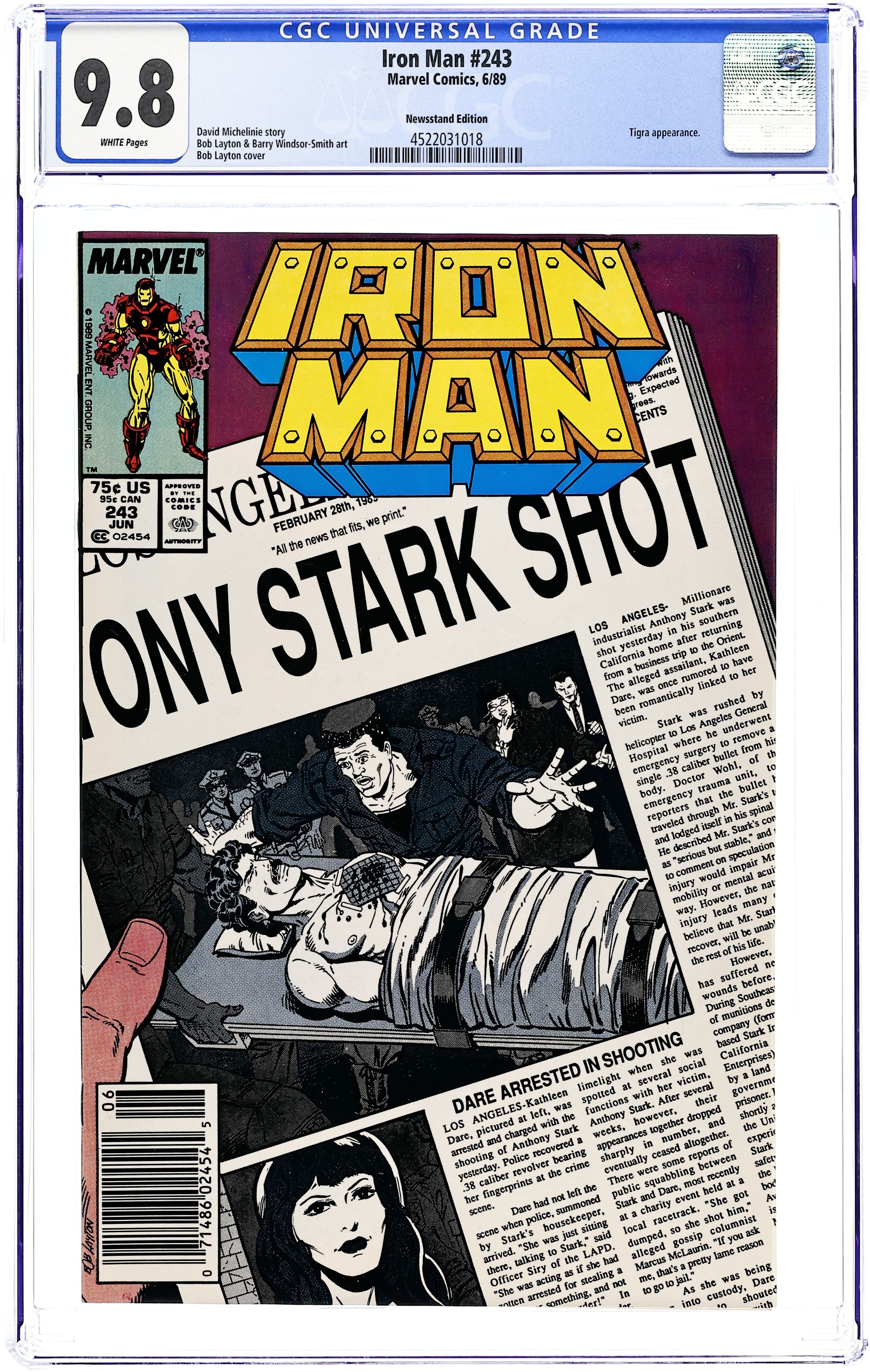 Newsstand Edition. "Heartbeaten" Plot by David Michelinie and Bob Layton. Script by David Michelinie. Pencils by Bob Layton. Inks by Barry Windsor-Smith. Cover by Bob Layton. As shown on the shocking cover, Tony Stark has been shot! And the gunman (or gunwoman) is his erstwhile girlfriend Kathy Dare! Rhodey rushes Tony to Los Angeles General Hospital; and the doctors begin emergency surgery to save the golden avenger's life! In the meantime, good friends like Tigra and Scott Lang reflect upon Iron Man's impact on their lives. Will Tony be able to make a full recovery? The road ahead looks difficult. Cameo appearances by Marcy Pearson, Cassie Lang, Mrs. Arbogast, Rae LaCoste, Bryant Gumbel, and Justin Hammer. (Notes: This story was reprinted in 2019 in the softcover: Iron Man Return of the Ghost Epic Collection. The softcover collects Iron Man issues 233 thru 244.) 32 pages. Cover price $0.75.