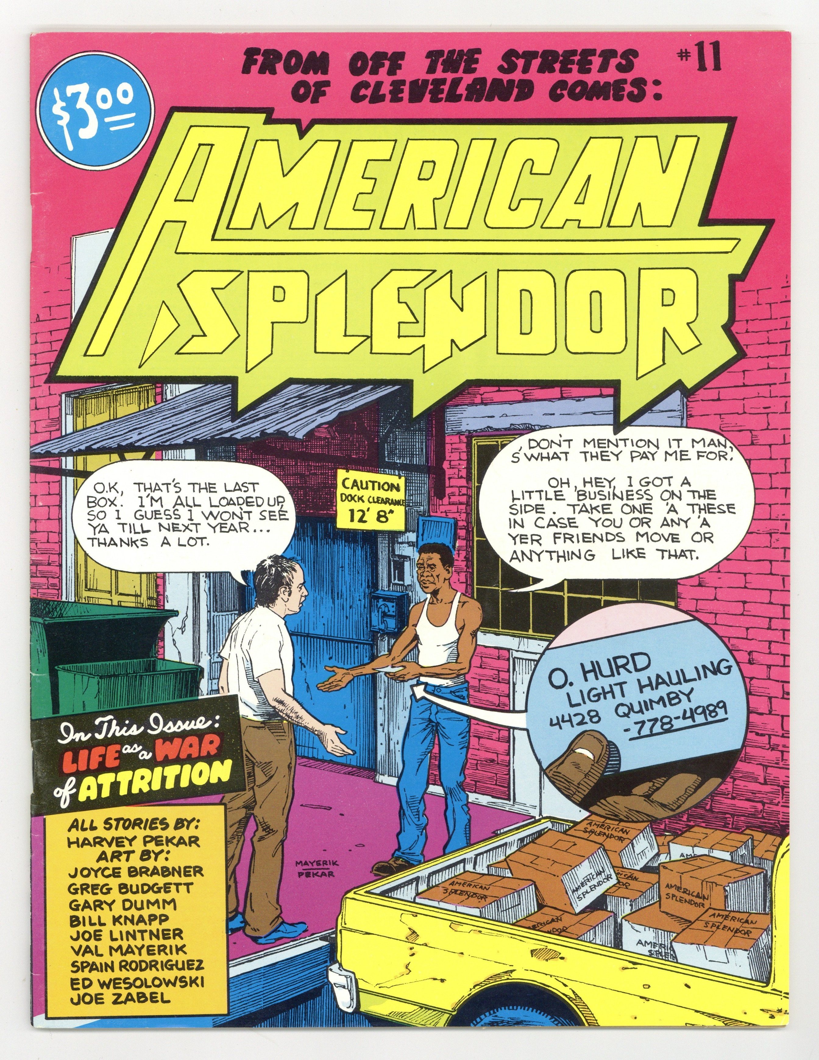 Cover art by Val Mayerik. A Matter of Life and..., script by Harvey Pekar, pencils by Val Mayerik; Harvey recalls his deteriorating behaviour in a shipping clerk job he had. Common Sense, script by Harvey Pekar, art by Val Mayerik; Harvey rides the bus while a bus driving instructor spouts out his "common sense." Time Flies... Time Drags, script by Harvey Pekar, art by Bill Knapp; Harvey has to drive back to Cleveland from Washington when he's not feeling too well. At The Bindery, script by Harvey Pekar, art by Val Mayerik; Harvey goes to collect the latest issue of his comic. Public Utility, script by Harvey Pekar, art by Joe Zabel; Harvey smells gas in his apartment. Interviewing The Interviewer, script by Harvey Pekar, art by Gary Dumm; A woman who's sent to interview Harvey tells a story about holidaying in Yosemite and crashing a press call for Queen Elizabeth. 60 pages, B&W. Cover price $3.00.