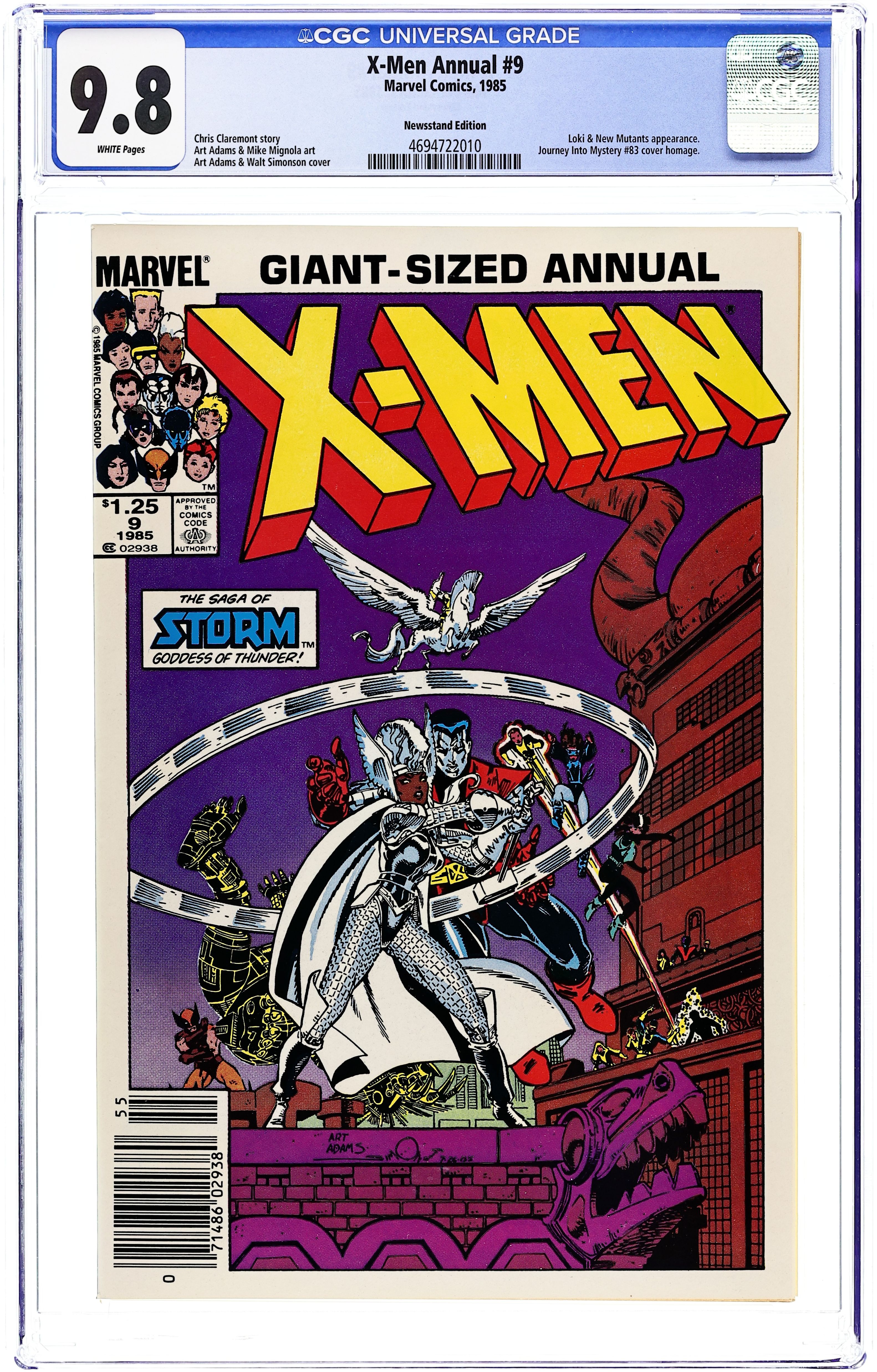 Newsstand Edition. The New Mutants and Loki guest star in "There's No Place Like Home." Script by Chris Claremont, pencils by Art Adams, inks by Alan Gordon, Mike Mignola, and Adams. Adams/Walt Simonson cover (based on the Thor/Journey Into Mystery 83 cover by Jack Kirby). New Mutants x-over continued from New Mutants Special Edition (1985) issue 1. 52 pgs. Cover price $1.25.