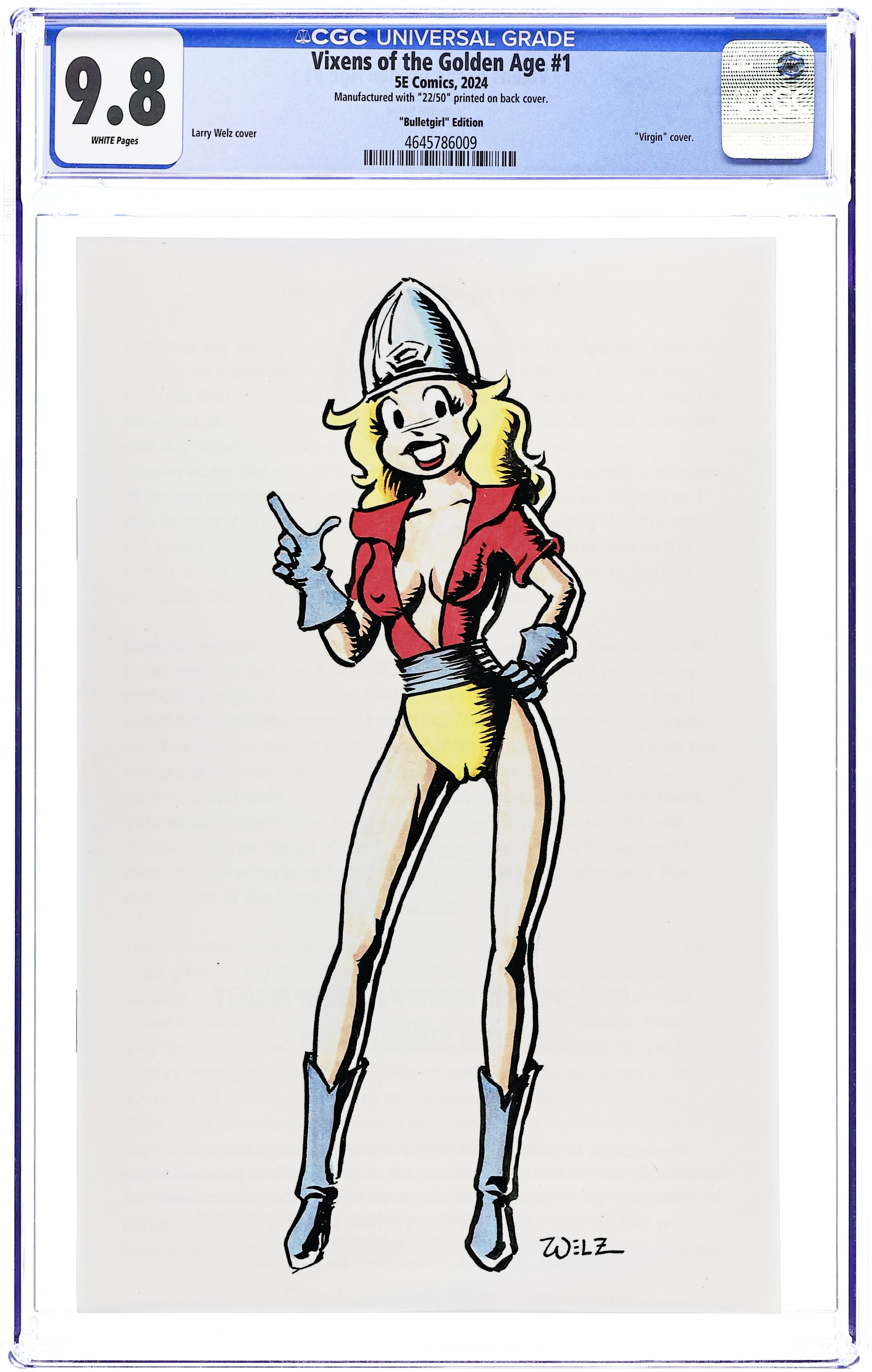 BulletGirl Edition Virgin Cover by Larry Welz - limited to 50 copies. Art by Dean Yeagle, Larry Welz, Patrick Finch, George Weber, Bill Maus, Yonami, Mary Bellamy, and more. A pin-up book featuring vintage female superheroes from the Golden Age of comics. Featuring commentary by Allan Pollett. Full Color.