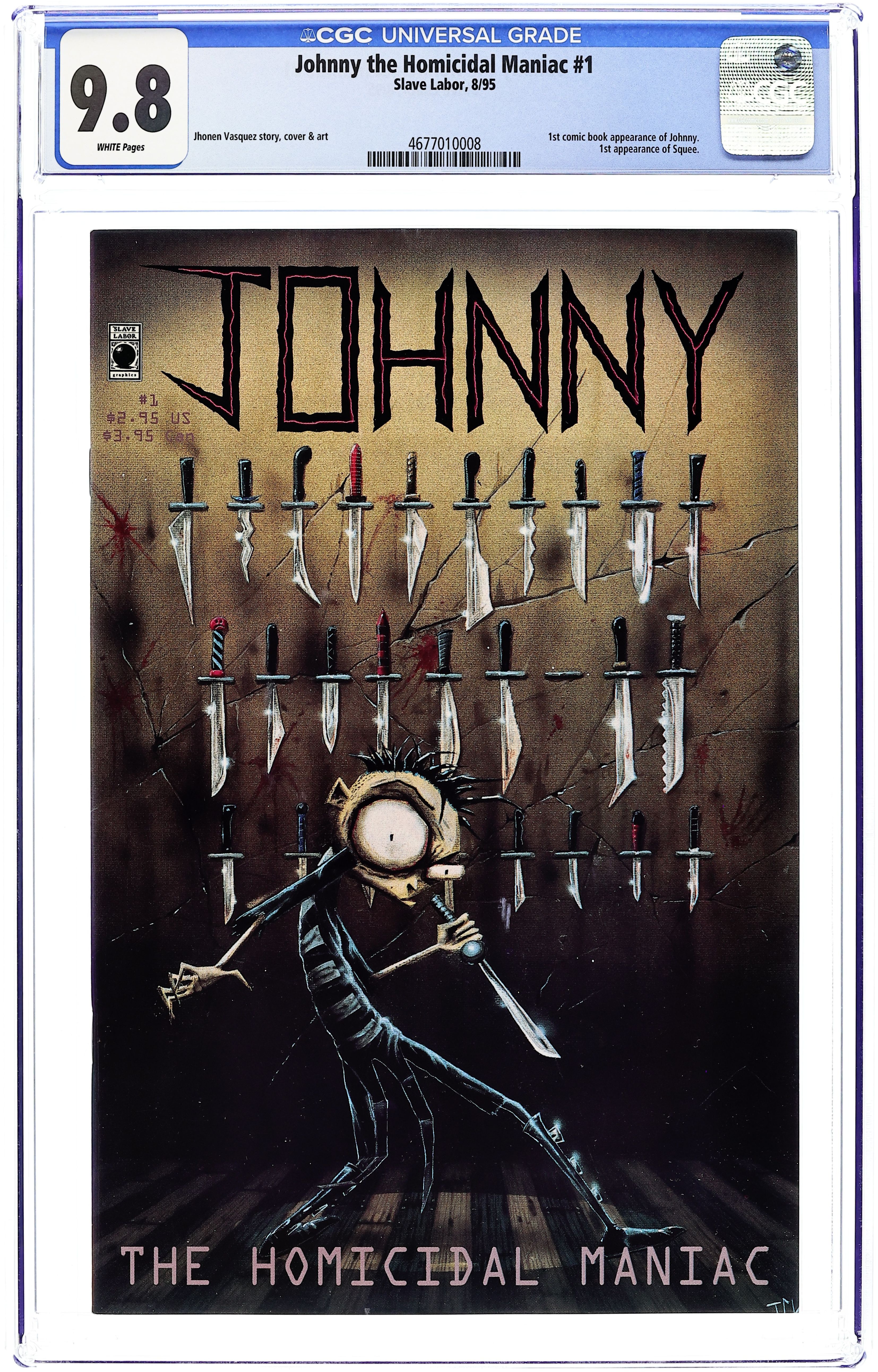First printing. Stories, art and cover by Jhonen Vasquez. The debut of the beloved goth series about the disturbed world of your friendly neighborhood serial killer. Johnny meets his hapless young neighbor, Squee; a survey taker knocks on the wrong door; Johnny goes on a restaurant rampage with a plastic spork. 28 pages, B&W. Mature readers. Cover price $2.95.
