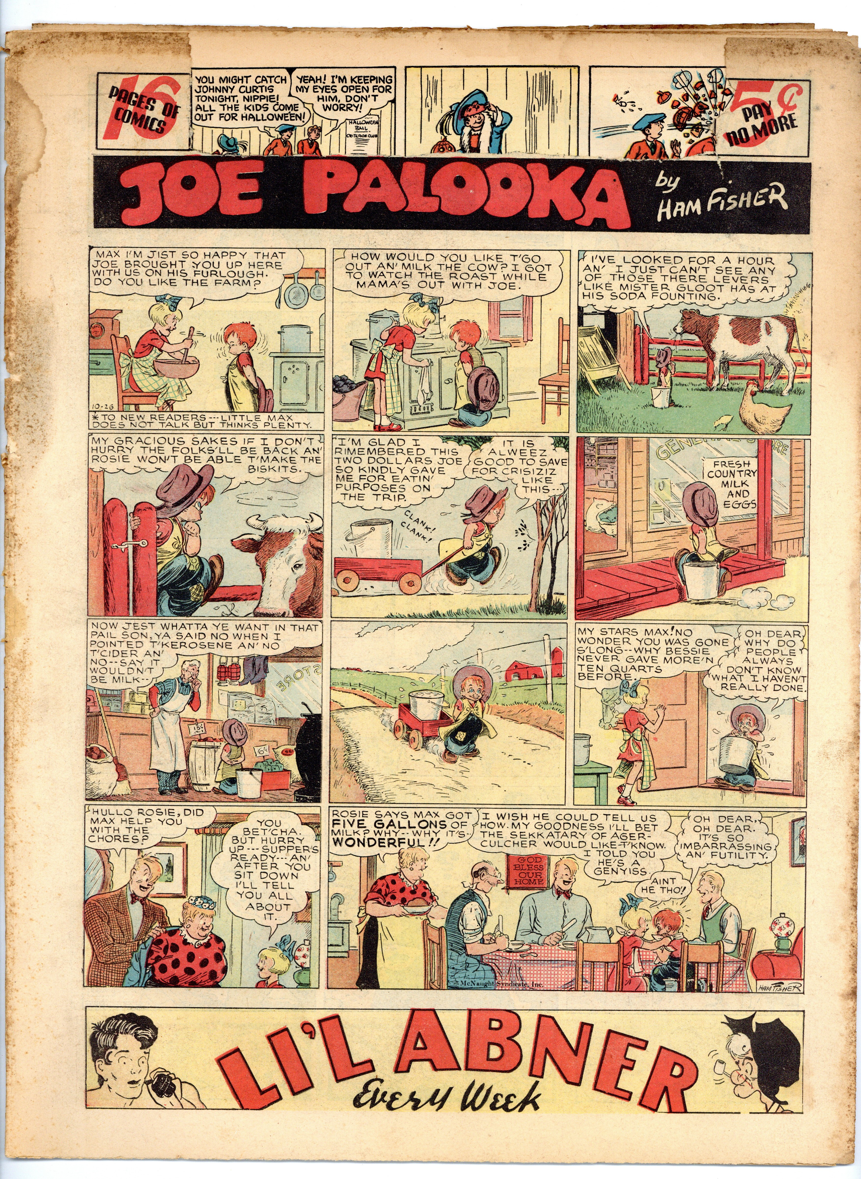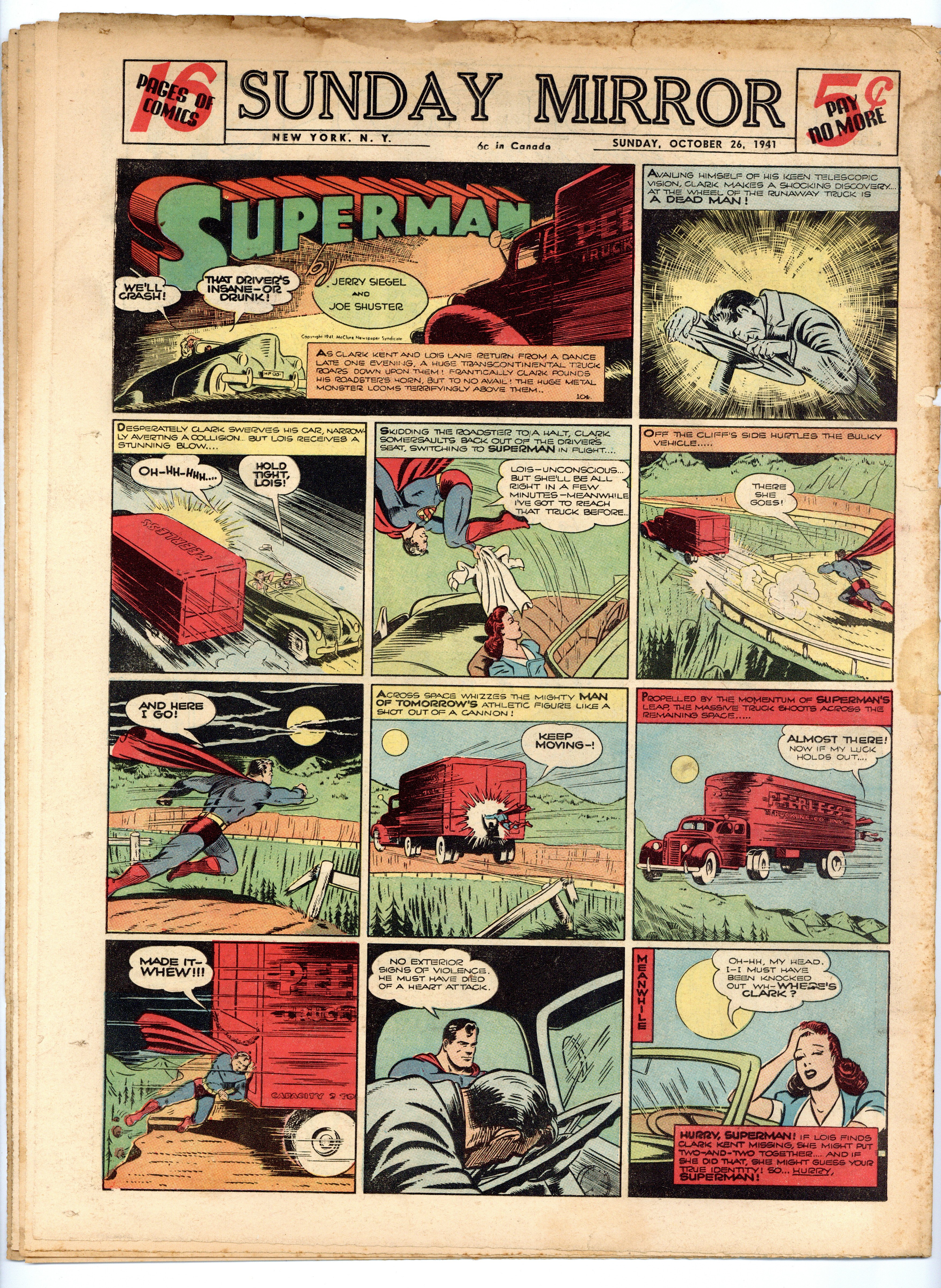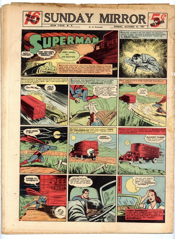 Sunday Mirror Newspaper Comic Insert dated October 26, 1941. This issue contains Joe Palooka, Black Fury (soon to be retitled "Miss Fury") by Tarpe Mills, Superman (in costume), Captain Easy, Barney Baxter, Li'l Abner, Dixie Dugan and other comic strips. 11.5 x 14.5 inches, 16 pages, full color, all newsprint. Cover price $0.05.