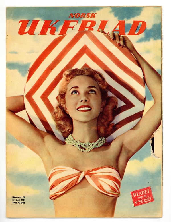 Published Jun 1951 by Hjemmet / Egmont.$6.00Norwegian weekly family magazine featuring articles on food, interior decoration, health, fashion, and beauty. Full color comic strip pages including Flash Gordon and Donald Duck. 10" x 13.75", 24 pages, PC/PB&W. Note: All text in Norwegian.