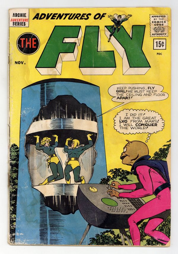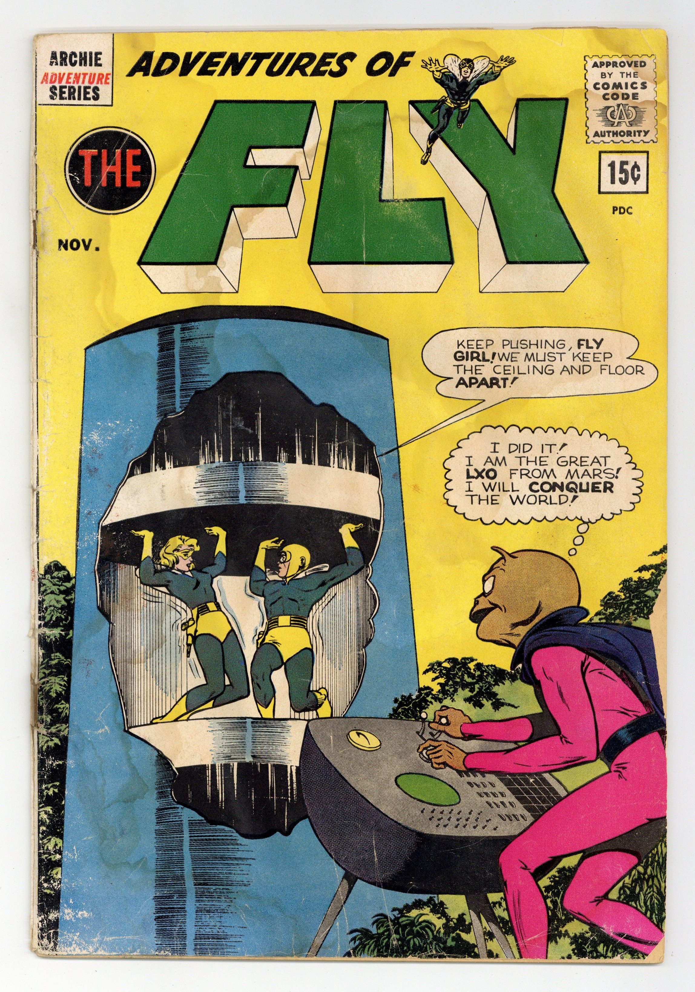 15ยข Edition. "The Ice Giant From Pluto," "Lxo III's Super-Weapon," and "The Man With the Chlordane Hands!" Edited by Victor Gorelick. Cover by John Rosenberger. Stories by Robert Bernstein and John Rosenberger. Archie Comics amiable and agile super-hero The Fly battles an assortment of nefarious villains, including the Ice Giant From Pluto and Lxo III. Ad for the latest issue of the Jaguar. Letter to the editor from mycomicshop.com owner Buddy Saunders. 36 pages, full color. Cover price $0.12.