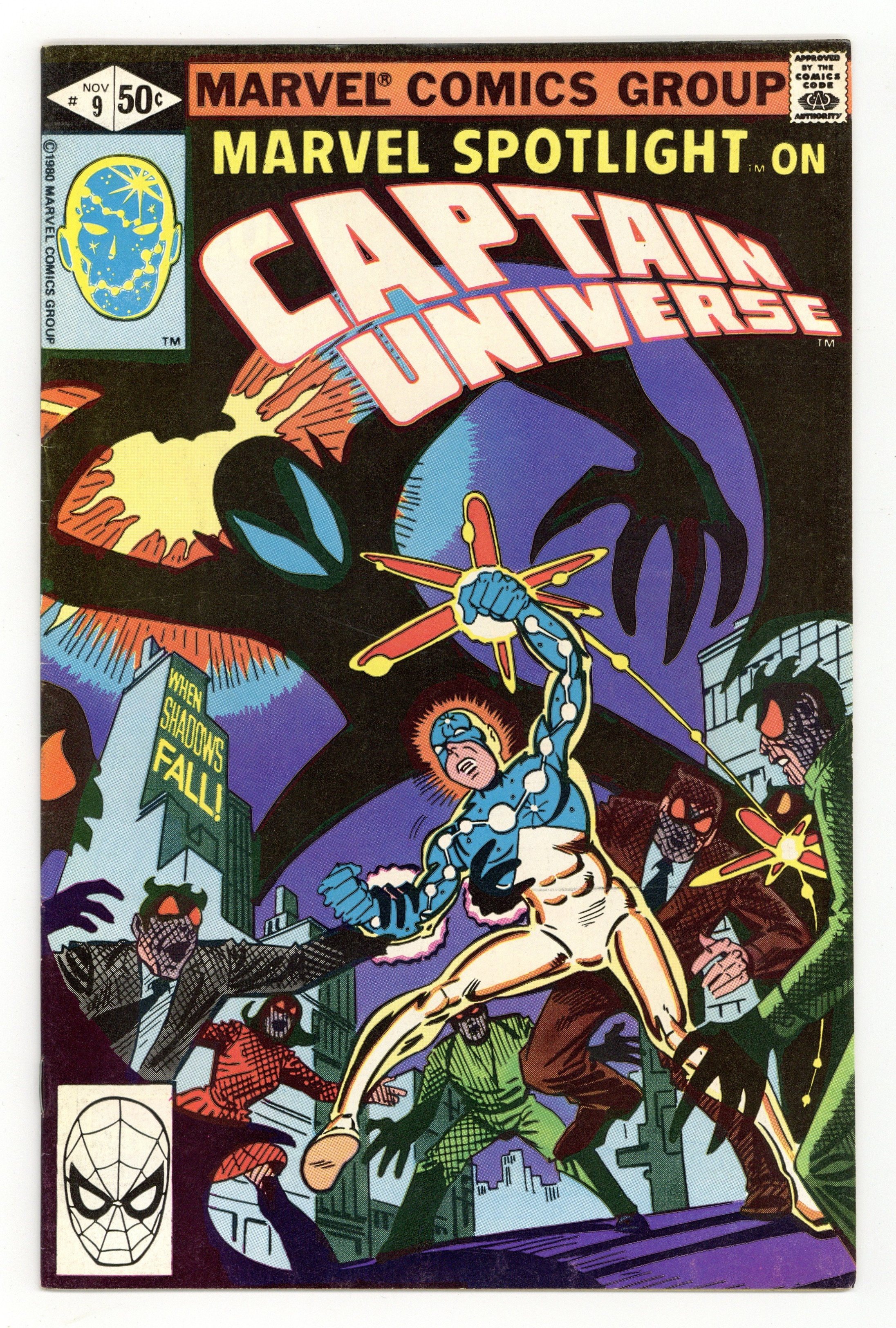Direct Edition. Marvel Spotlight on Captain Universe - "The Mystery of Mister E!" Written by Bill Mantlo. Art and cover by Steve Ditko. When a gathering darkness threatens to eclipse all life on Earth only the cosmic force known as Captain Universe has the power to save it! 32 pages, FC. Cover price $0.50.