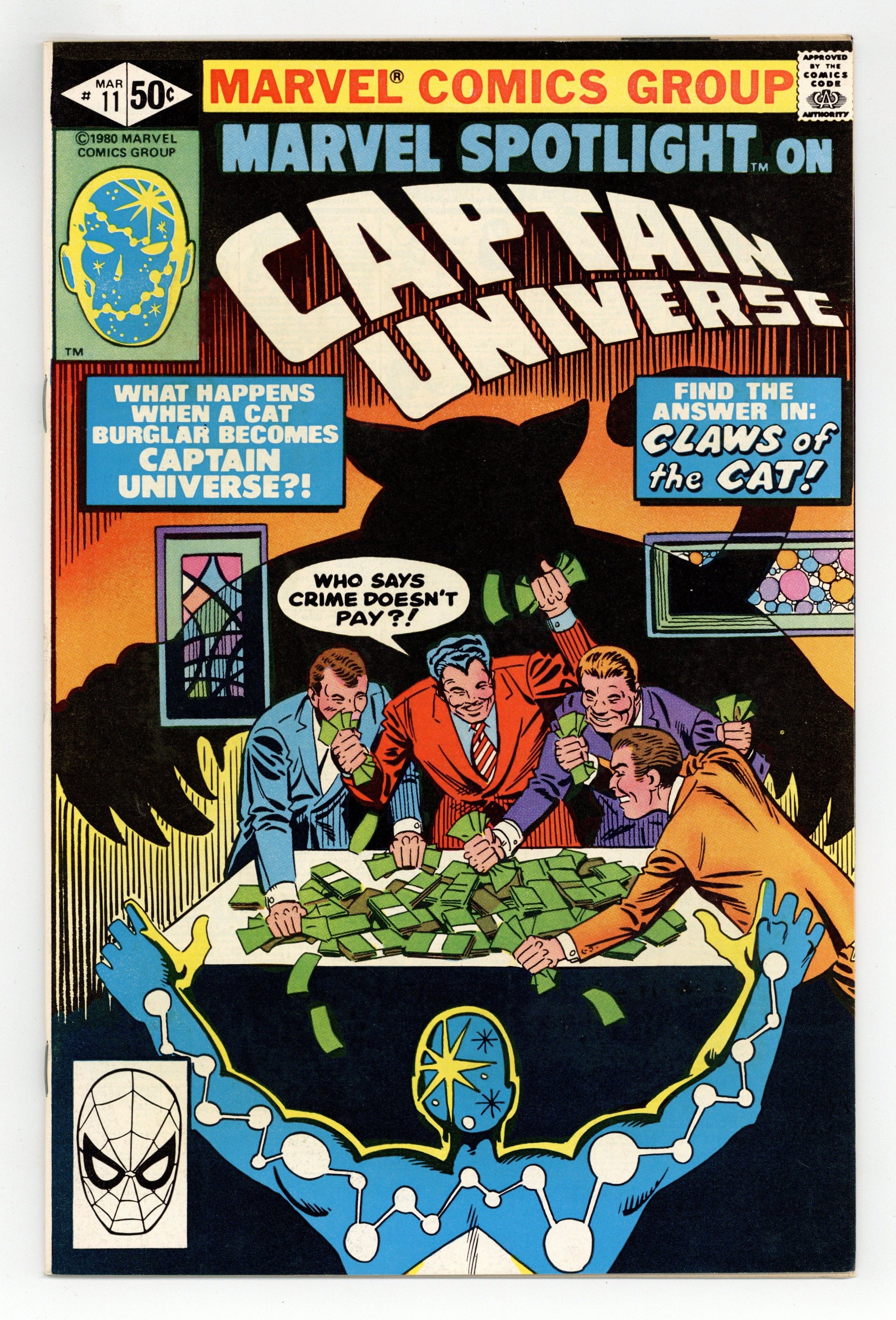 Final Issue - Marvel Spotlight on Captain Universe - "The Big Time!" Written by Bill Mantlo. Art and cover by Steve Ditko. What happens when a cat burglar becomes the most powerful super hero in the universe? The answer may surprise you. 32 pages, FC. Cover price $0.50.