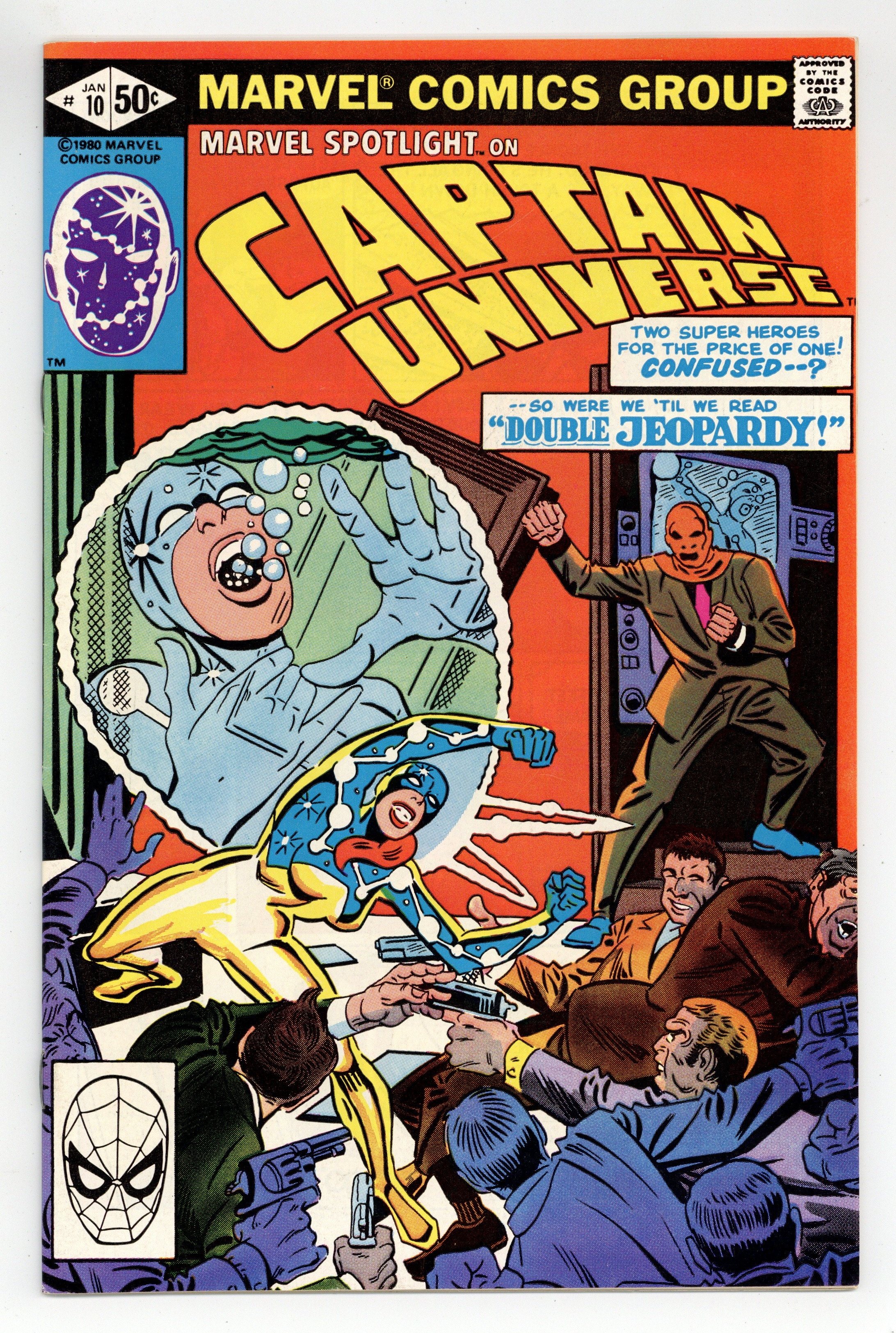 Marvel Spotlight on Captain Universe - "Double Jeopardy!" Written by Bill Mantlo. Art and cover by Steve Ditko. Get ready for the strangest Captain Universe adventure yet as and get two heroes for the price of one! 32 pages, FC. NOTE: Includes a full-page Dr. Strange ad by Frank Miller (at one point he was scheduled to become the regular artist on the series). Cover price $0.50.