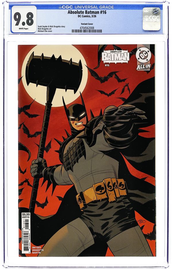 (W) Scott Snyder (A) Nick Dragotta (CA) Michael Cho ABSOLUTE BATMAN IN HELL! Part two of our Absolute Batman/Absolute Wonder Woman story-- Bruce Wayne is on a desperate hunt to help his friend Waylon, now transformed into a monstrous crocodile roaming the sewers, consumed with a deadly hunger. Batman's last option for a cure is to turn to a god for help...but will he have to descend into the depths of hell to get it? 32 pages, full color, rated 15+. Cover price $5.99.