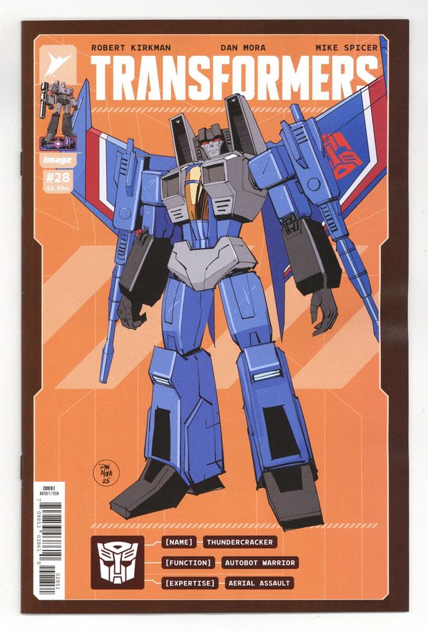 Tags: Transformers$20.50Limited 1 for 50 Retailer Incentive Variant Cover.(W) Robert Kirkman (A) Dan Mora, Mike Spicer (CA) Dan Mora, Andres Juarez MIRAGE and BULKHEAD are back in action! Get ready for awesome! And Arcee makes a stunning decision THAT WILL SHOCK EVERY TRANSFORMERS FAN! 32 pages, full color, rated T. Cover price $3.99.