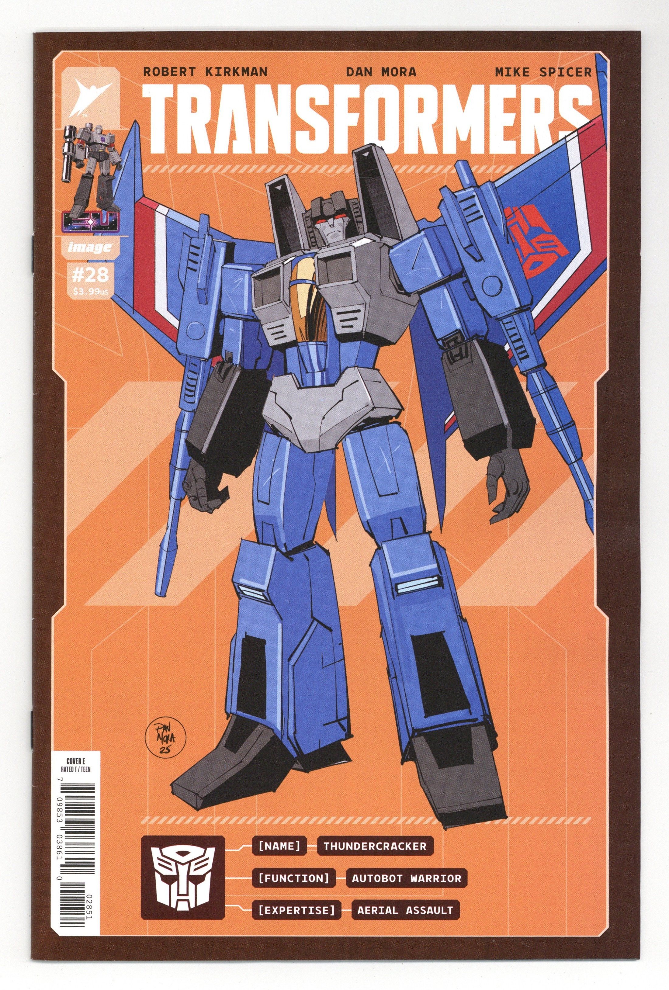 Tags: Transformers$18.00Limited 1 for 50 Retailer Incentive Variant Cover.(W) Robert Kirkman (A) Dan Mora, Mike Spicer (CA) Dan Mora, Andres Juarez MIRAGE and BULKHEAD are back in action! Get ready for awesome! And Arcee makes a stunning decision THAT WILL SHOCK EVERY TRANSFORMERS FAN! 32 pages, full color, rated T. Cover price $3.99.