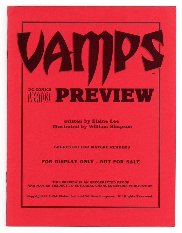 Retailer Preview. Story by Elaine Lee. Art by William Simpson. These booklets were sent to retailers to help promote the upcoming series. Uncorrected proof of the first 24 pages of Vamps (1994) #1. Saddle stitched. 8 1/2" X 11". B&W. 32 pages.