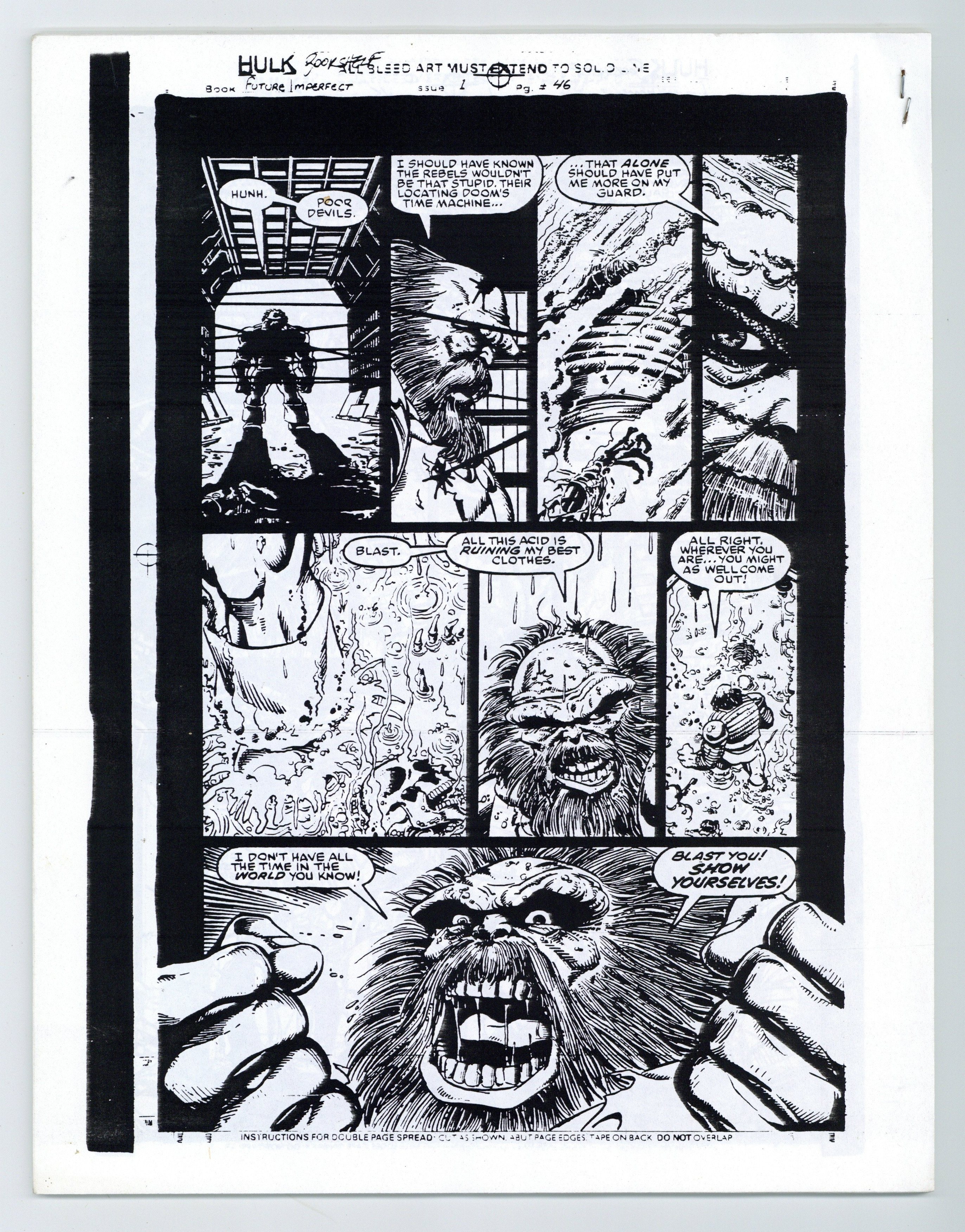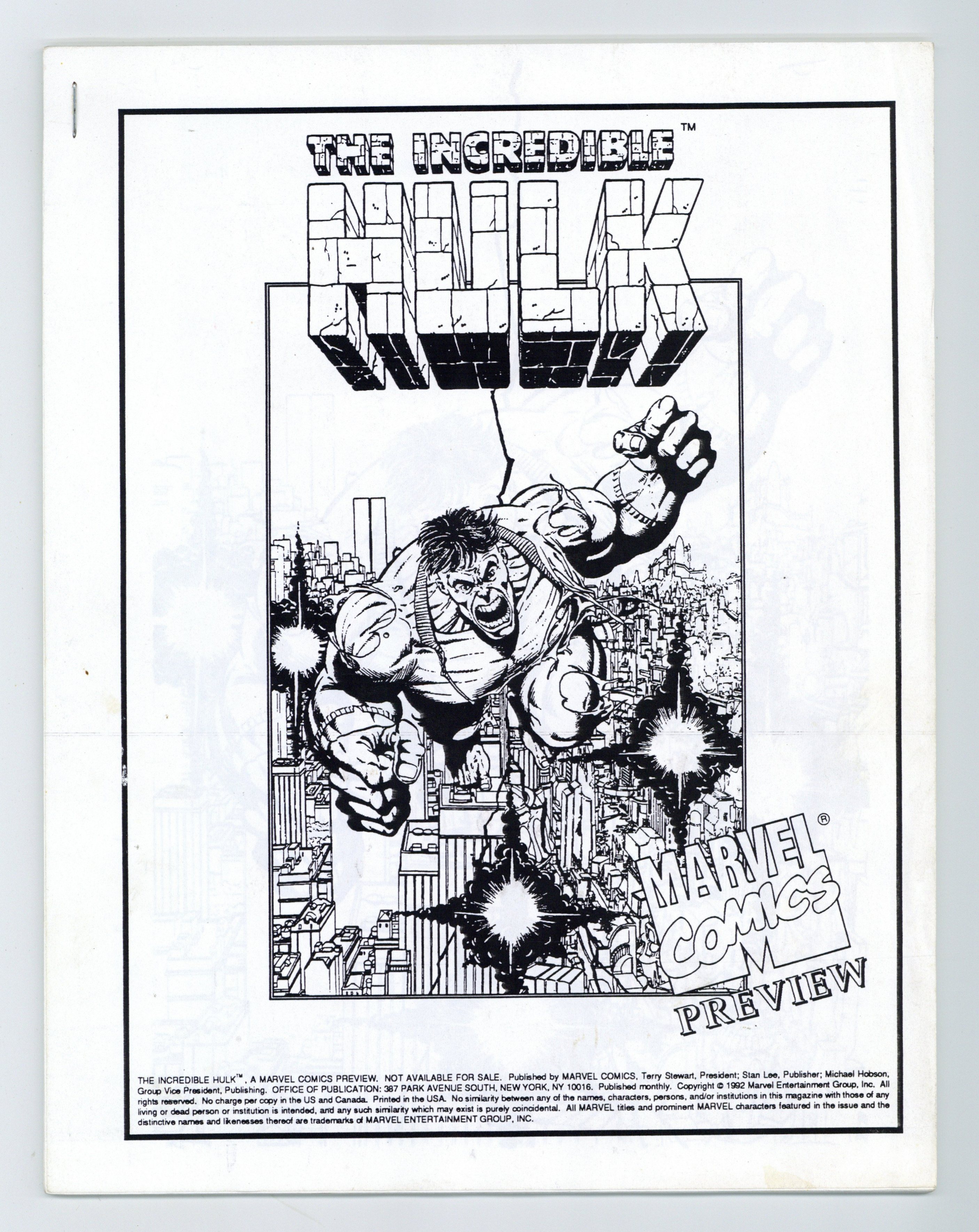 Retailer Preview. Story by Peter David. Art by George Perez. These booklets were sent to retailers to help promote the upcoming series. Uncorrected proof of 46 pages of Hulk Future Imperfect (1992) #1. Loose pages stapled. 8 1/2" X 11". B&W. 50 pages.